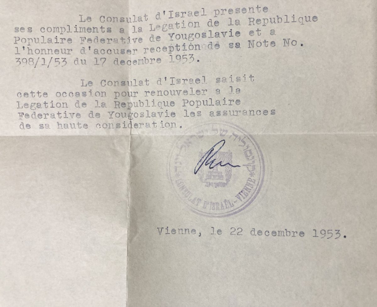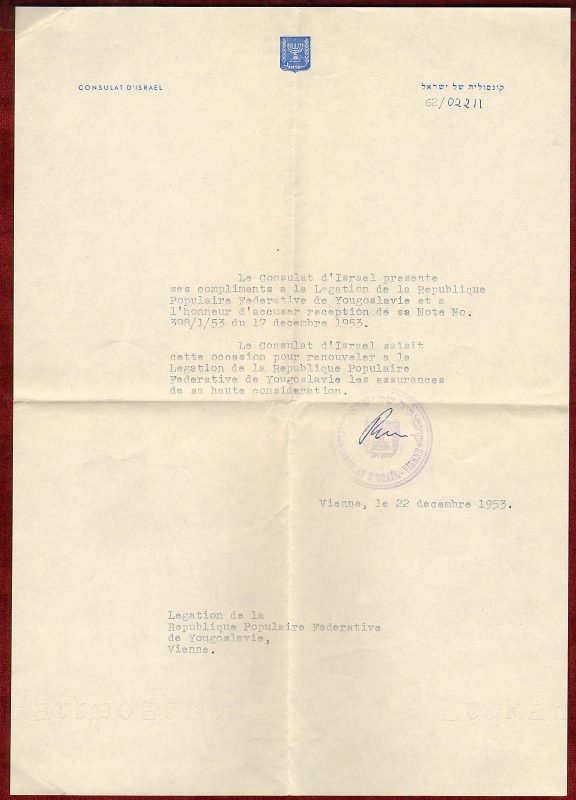 Signed and stamped letter by Israel consulate in Vienna, Austria,  to Embassy of Yugoslavia in Vienna, Austria.
