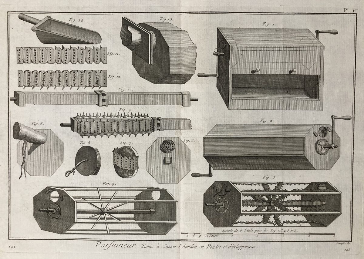 1785 ORIGINAL ANTIQUE COPPERPLATE ENGRAVING of Parfumeur, Tamis a sasser l’amidon en poudre et developpemens (The sieve used to sift into a powder)