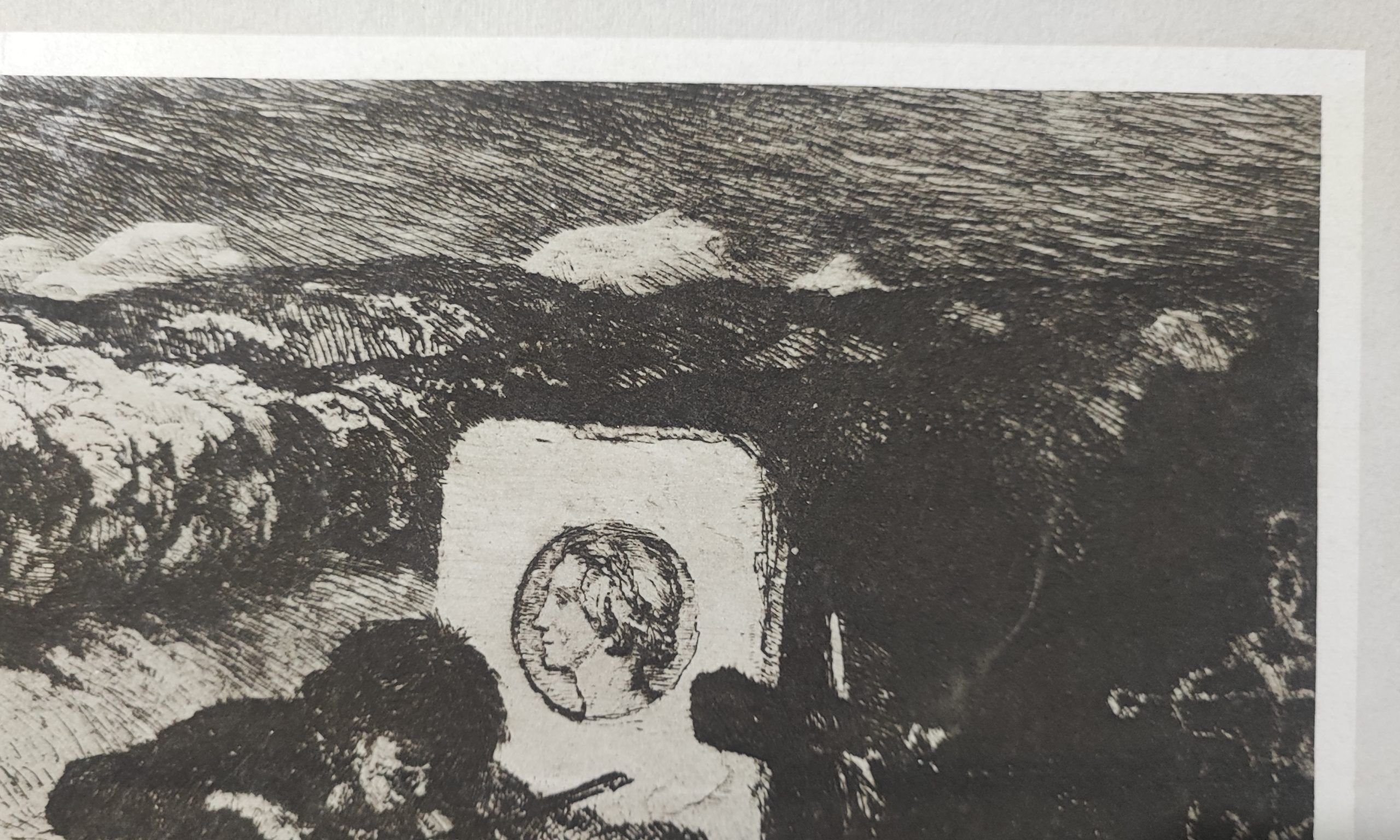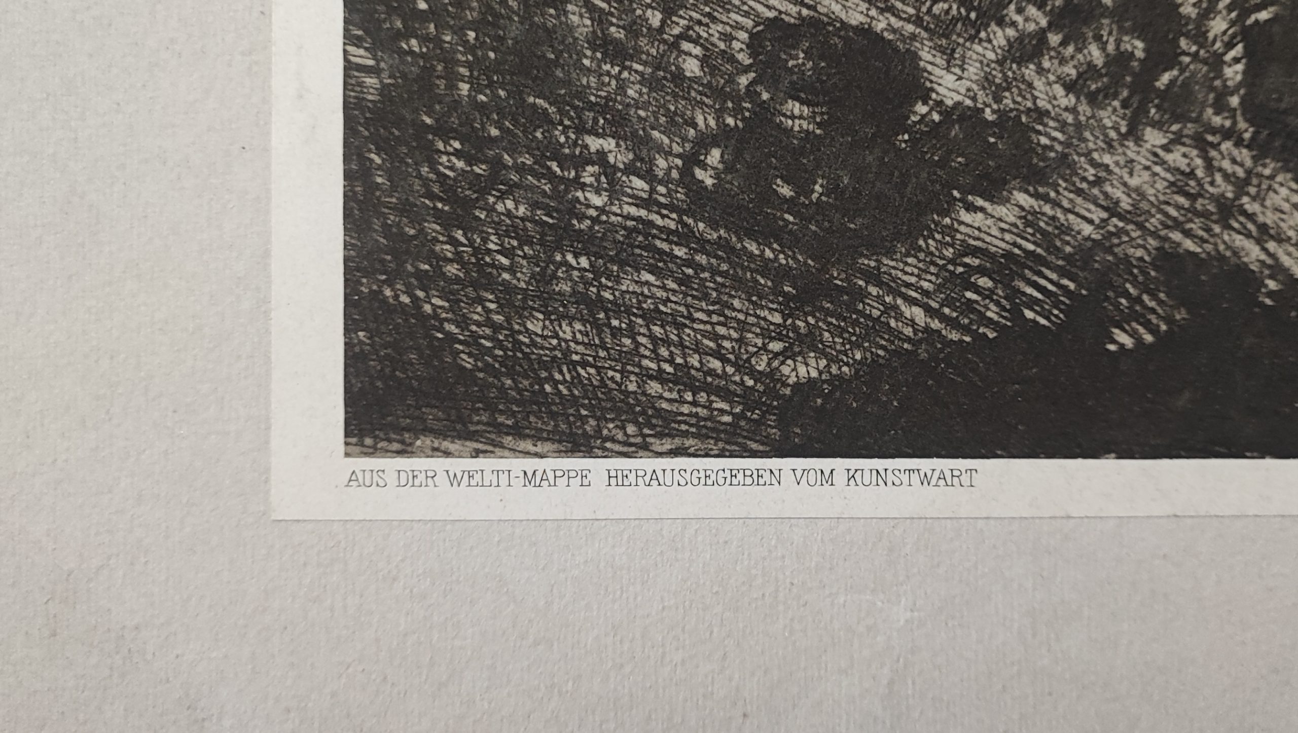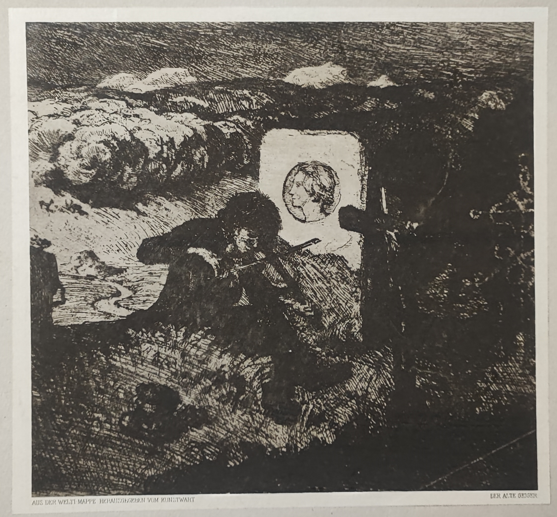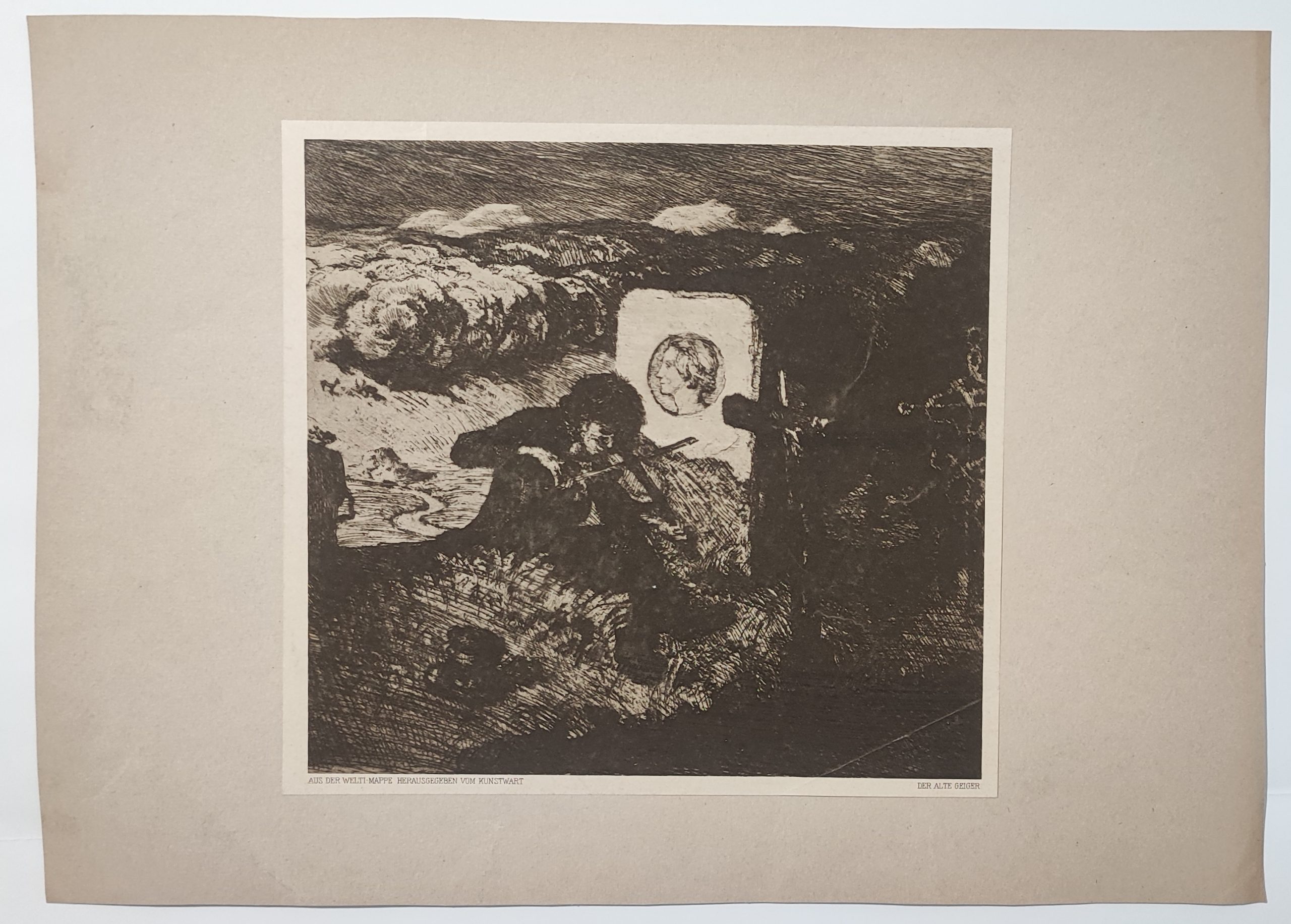 The antique decorative print is showing the scene of a man playing the violin. From Der Welti Mappe, published by G. D. W. Callwey in Munich, 1925.