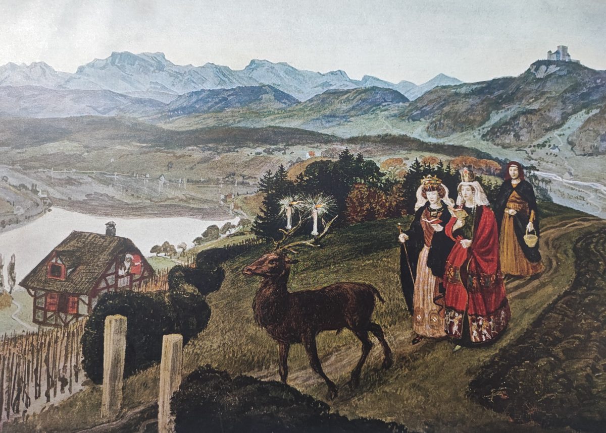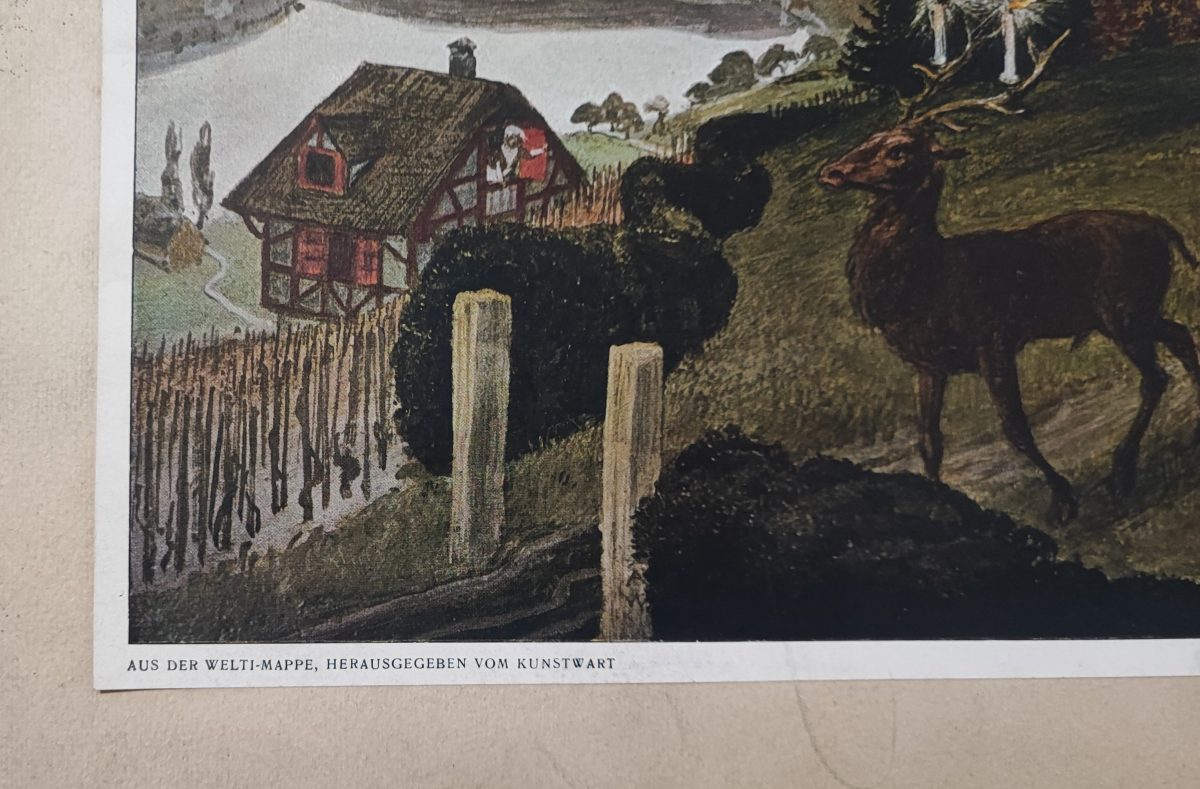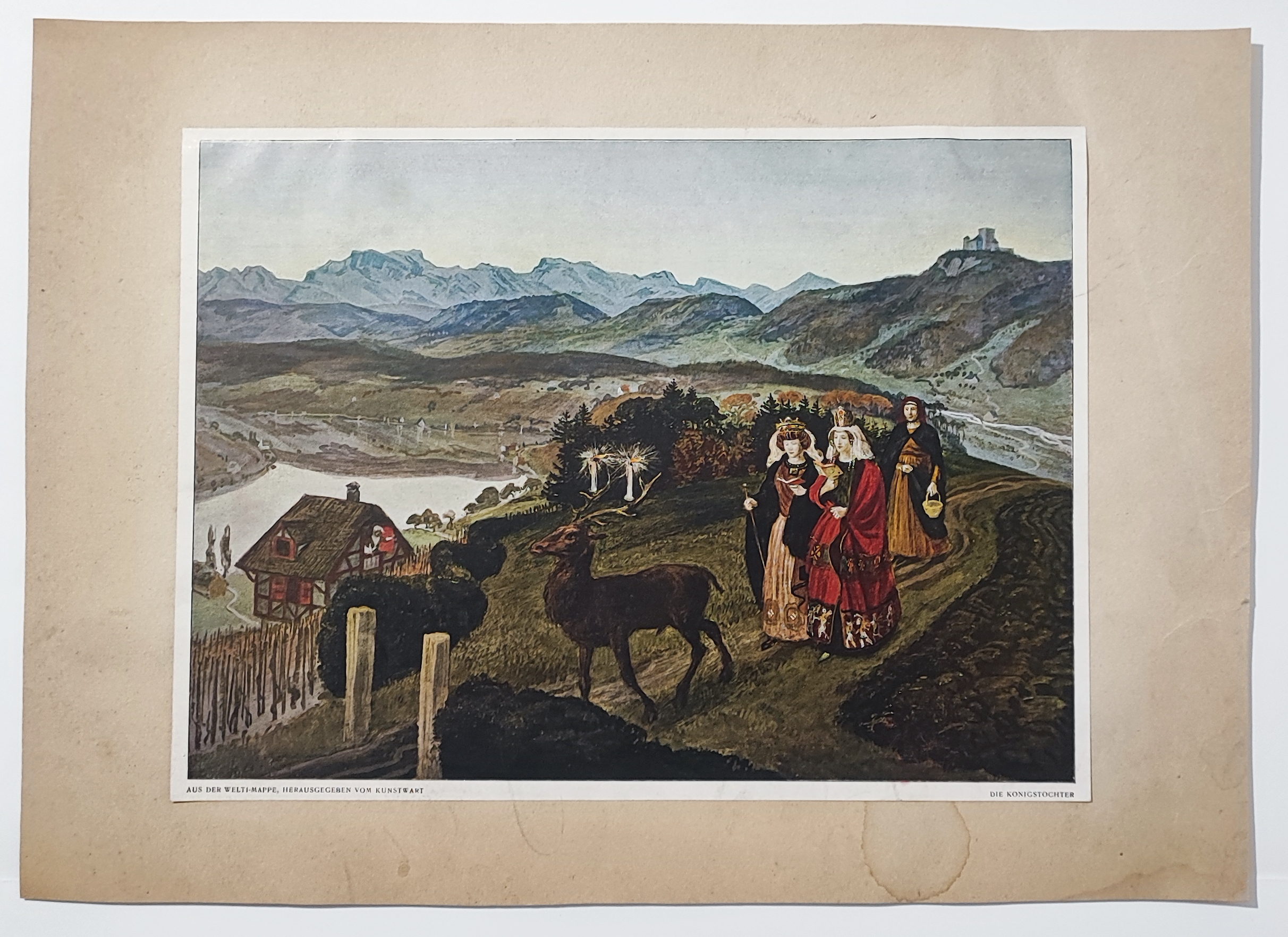 The antique decorative print shows the scene of the king’s daughter and her escort,  from Der Welti Mappe, published by G. D. W. Callwey in Munich, in 1925.