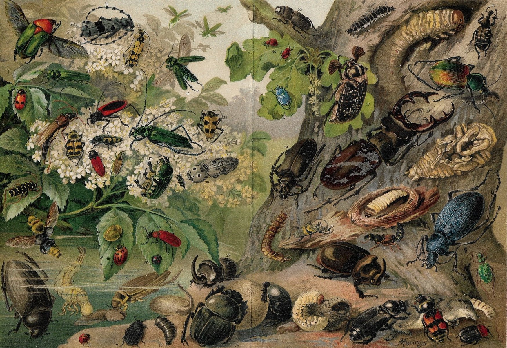Original antique print titled Kafer showing various beetles, ladybirds, centipedes, and caterpillars. The plate is from the renowned German encyclopedia, ‘Meyers grosses Konversations-Lexikon,’ dating back to the circa 1900 edition, published in Leipzig and Vienna.