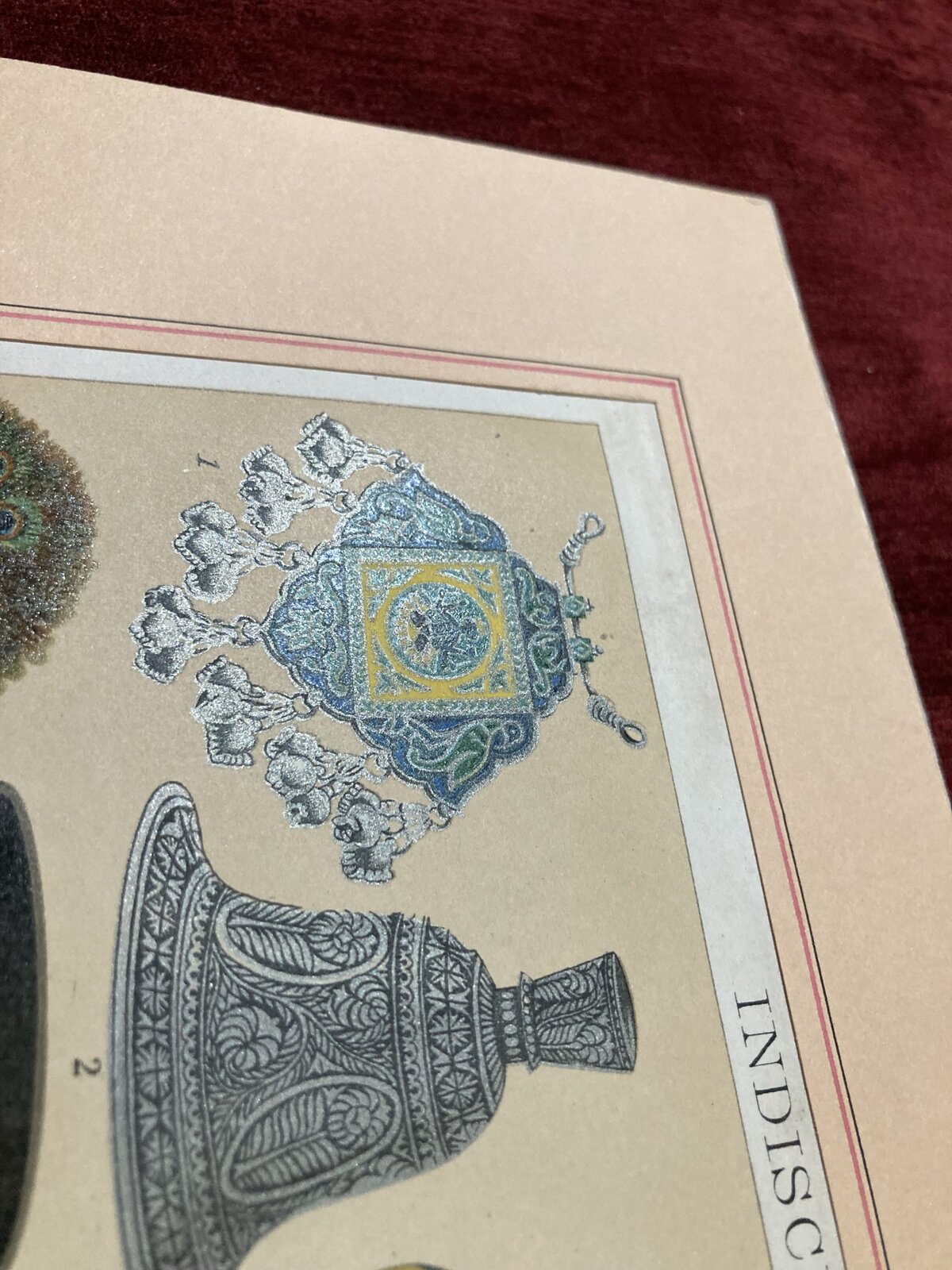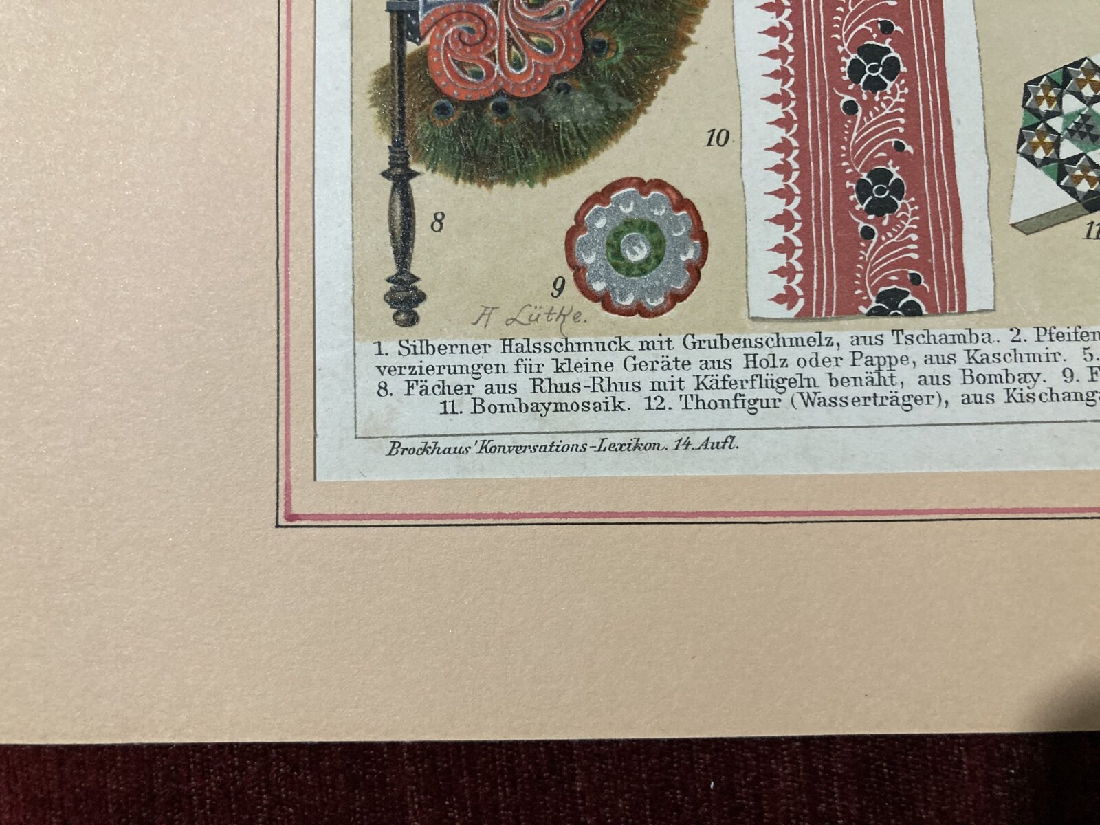 Beautiful chromolithography of fourteen enumerated pieces of Indian art. This chromolithography may become a great addition to any collection or can be presented as a unique gift that will brighten the recipient’s wall and give it a touch of antique.