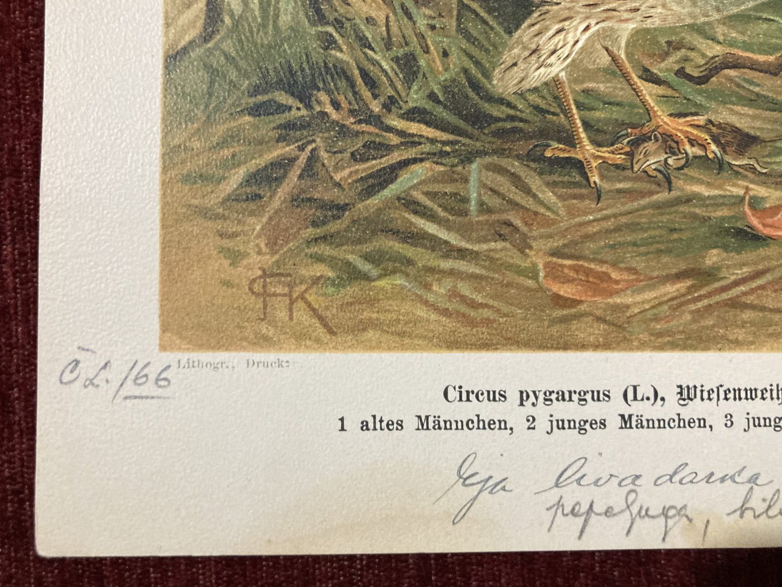 This engraving shows a bird species:  The Montagu’s Harrier (Circus pygargus) Year printed: end of the 19th or just the beginning of the 20th century.