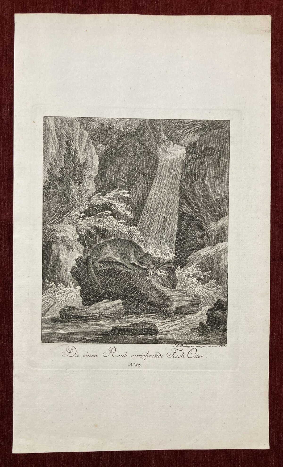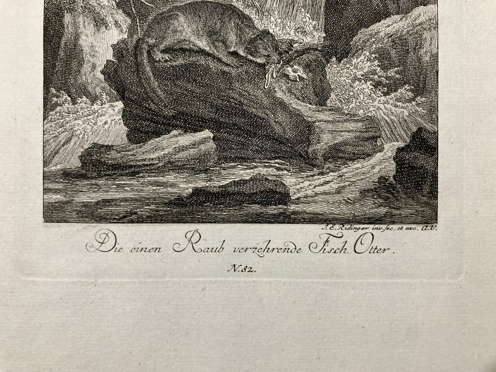 An original antique print showing an otter hunting fish in its natural habitat. Made by one of the most famous German engravers of animals, Johann Elias Ridinger. This engraving may become a great addition to any collection or can be presented as a unique gift that will brighten the recipient’s wall and give it a touch of the antique.