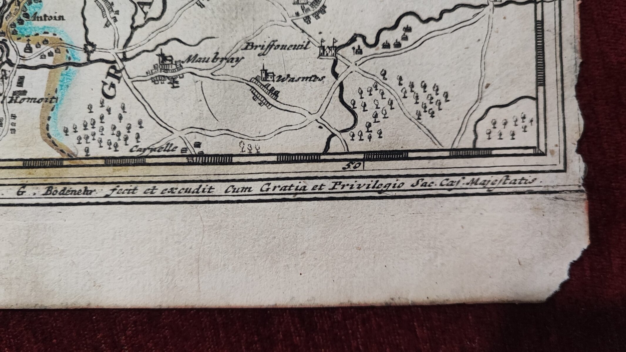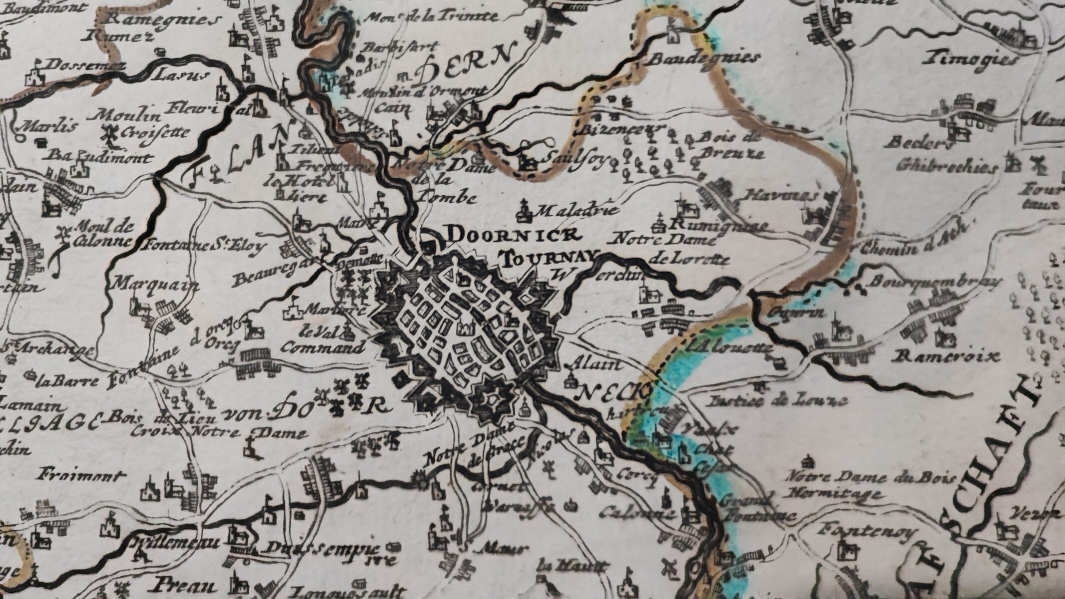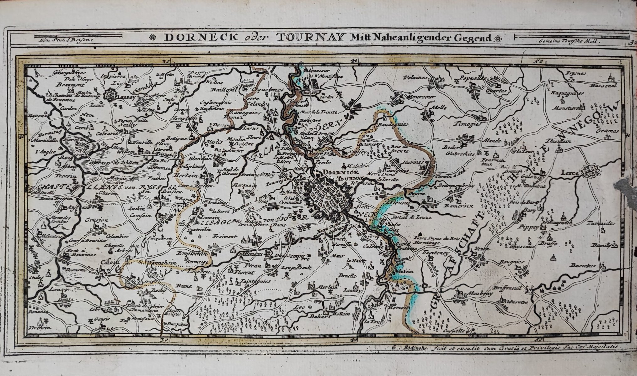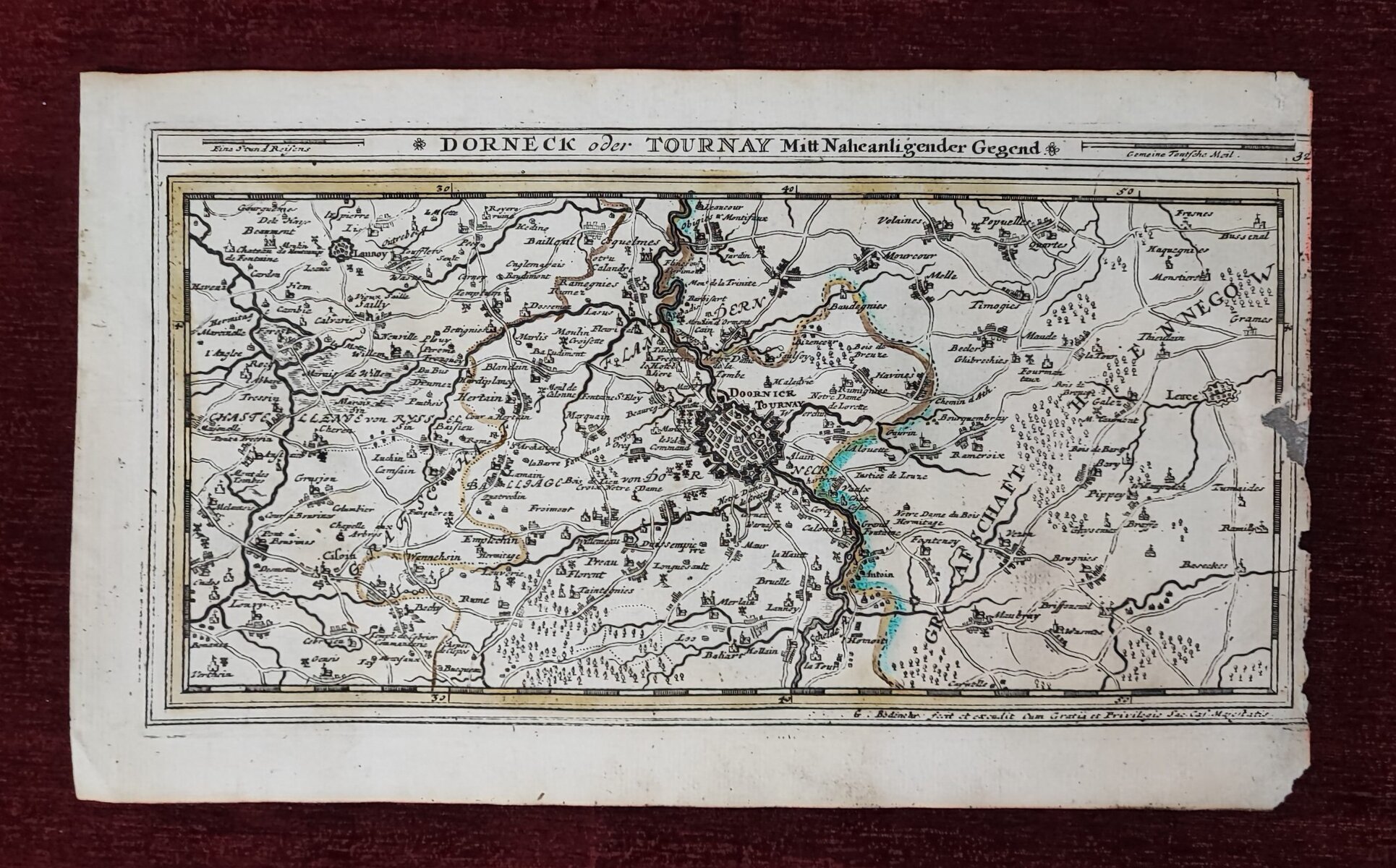 Copperplate engraved map by Gabriel Bodenehr. The map depicts the city and municipality of Tournai, located in the province of Hainaut, Belgium.