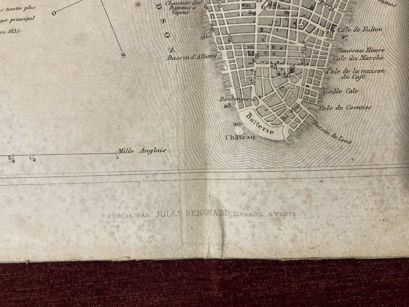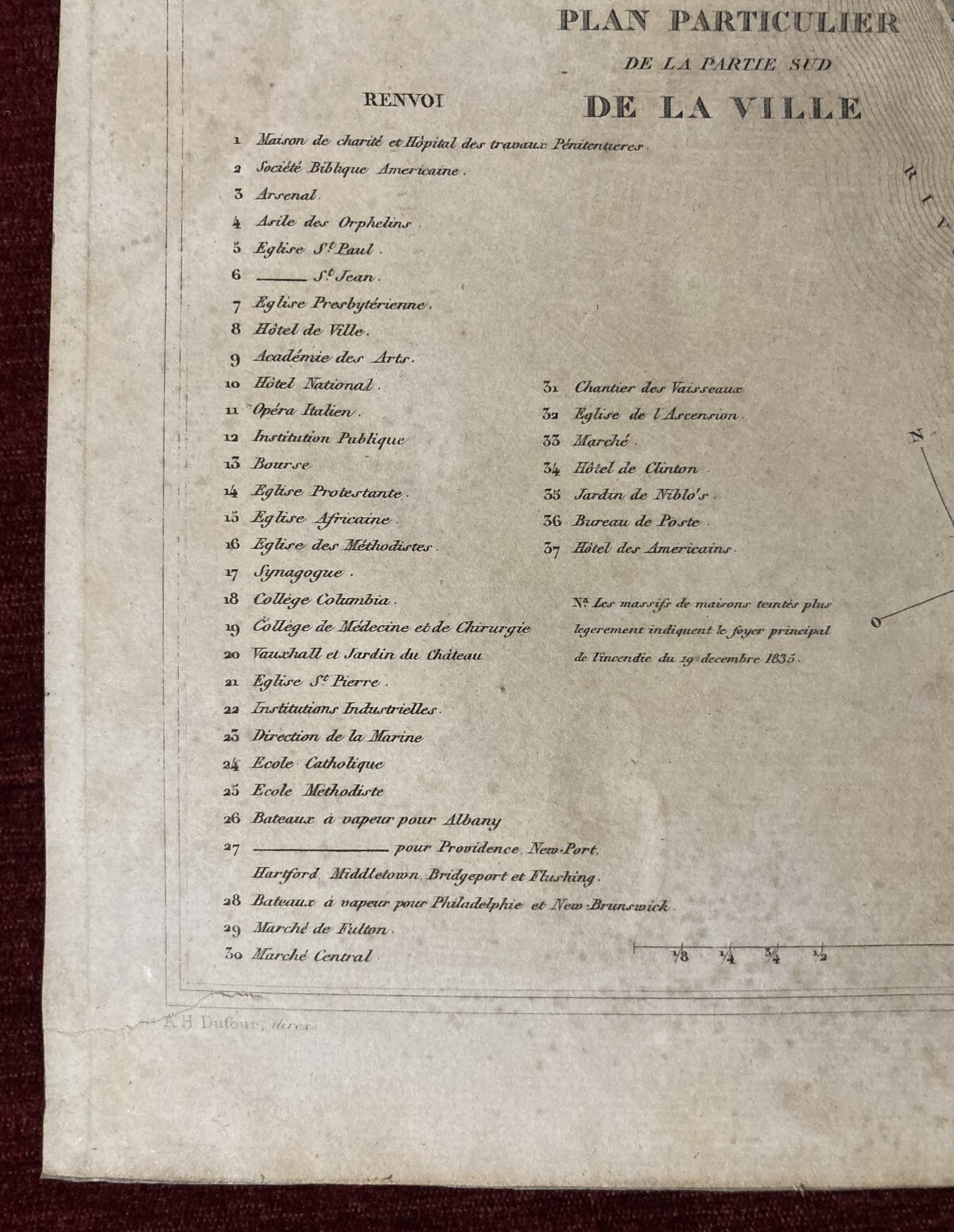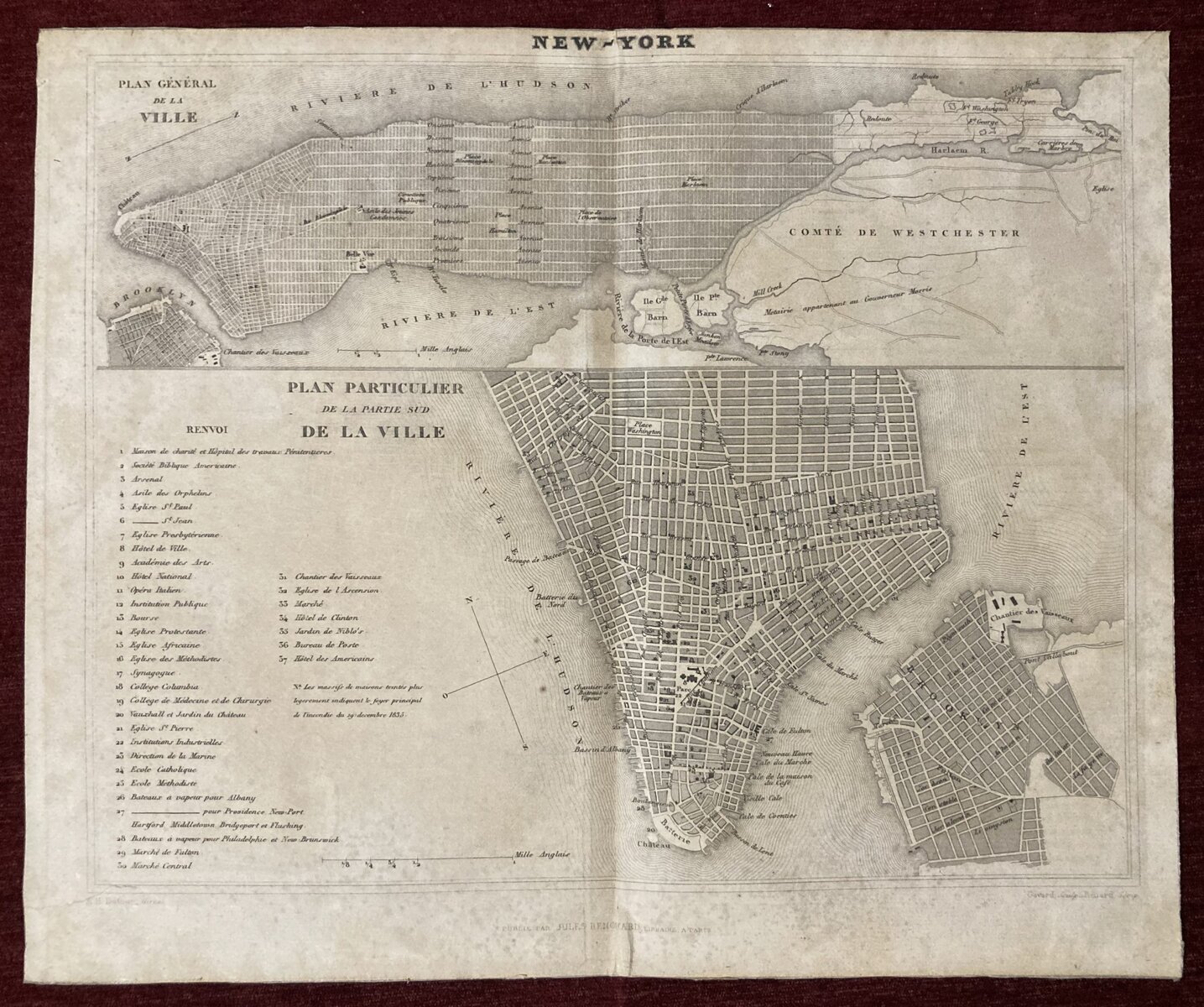 The lower map, Plan Particulier de la Partie Sud de la Ville, focuses on Lower Manhattan, stretching north to Washington Place and including a detailed inset of Brooklyn. A comprehensive key identifies 37 important landmarks including churches, colleges, armories, ferry terminals, marketplaces, and civic institutions—offering a valuable snapshot of the city’s infrastructure at the time.