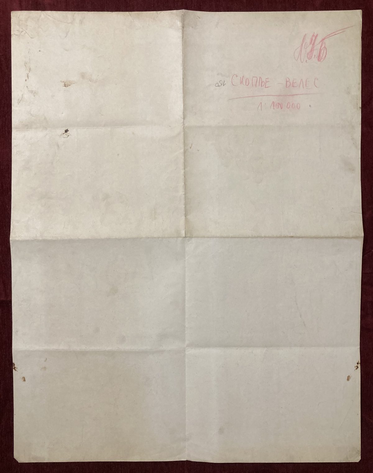Condition: Signs of folding, small tears along the edges, one tear on the right border (approx. 2 cm), small hole in the center, pencil and crayon inscriptions (on the front and back), small spots and stains on the back.
