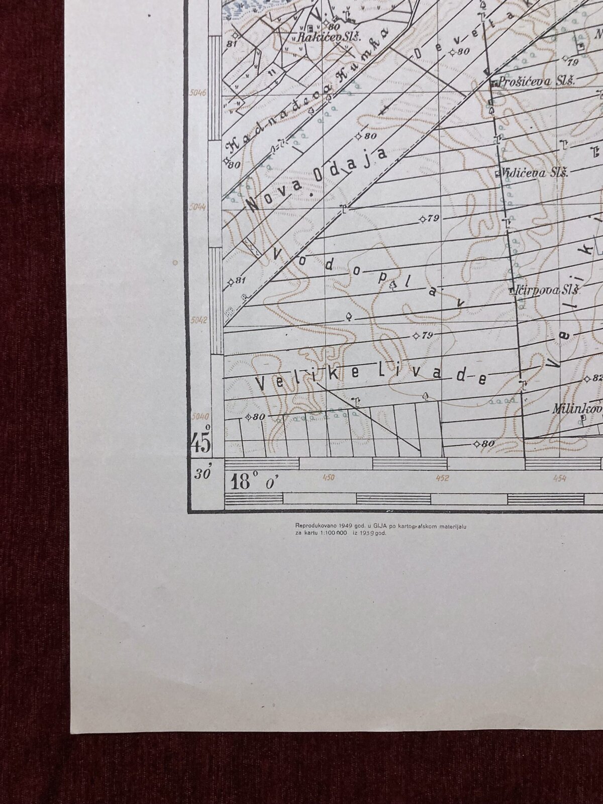 Dimensions: 68,5 x 48,5 cm. Scale: 1 : 50.000. Year: 1949. Printed by Војногеографски институт, Београд (Military Geographical Institute) in Belgrade, Serbia. Map of the Југословенске народне армије (Yugoslav People’s Army).