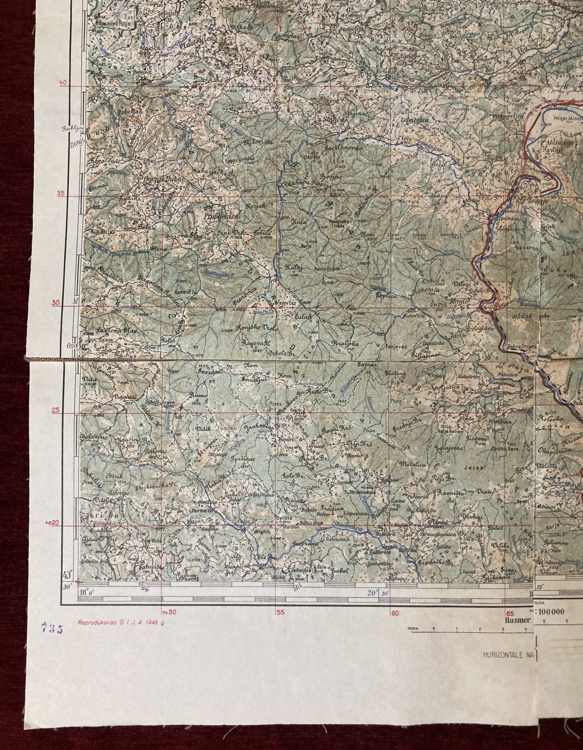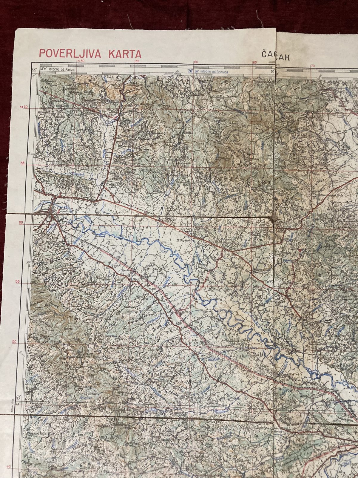 A rare, classified, original, and highly detailed topographic military map of Cacak and its surroundings.