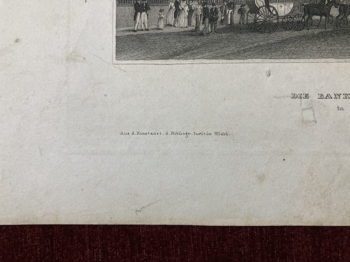 The antique print shows the view of the Bank of England, in London. This steel engraving originates from a Dutch edition of ‘Meyer’s Universum’, published and printed by the ‘Bibliographical Institute seated in Hildburghausen, Germany in 1837. The work consists of several parts/books describing important views of nature and art in all parts of the world.