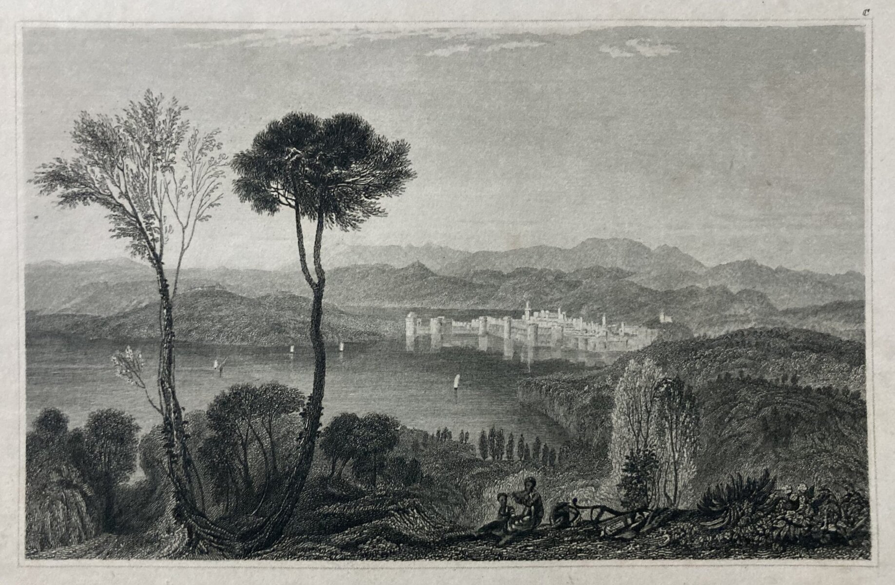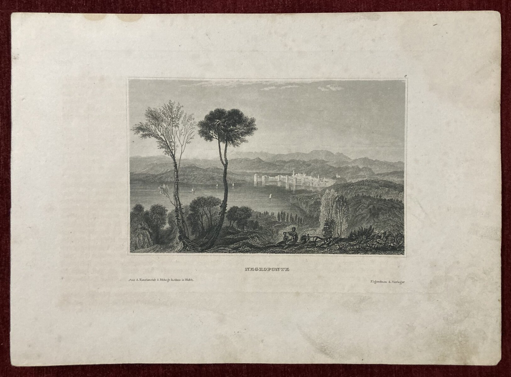 The antique print shows the view of Neogrponte, the capital of Euboea, Greece. This steel engraving originates from a Dutch edition of ‘Meyer’s Universum’, published and printed by the ‘Bibliographical Institute seated in Hildburghausen, Germany in 1837. This work consists of several parts/books describing important views of nature and art in all parts of the world.