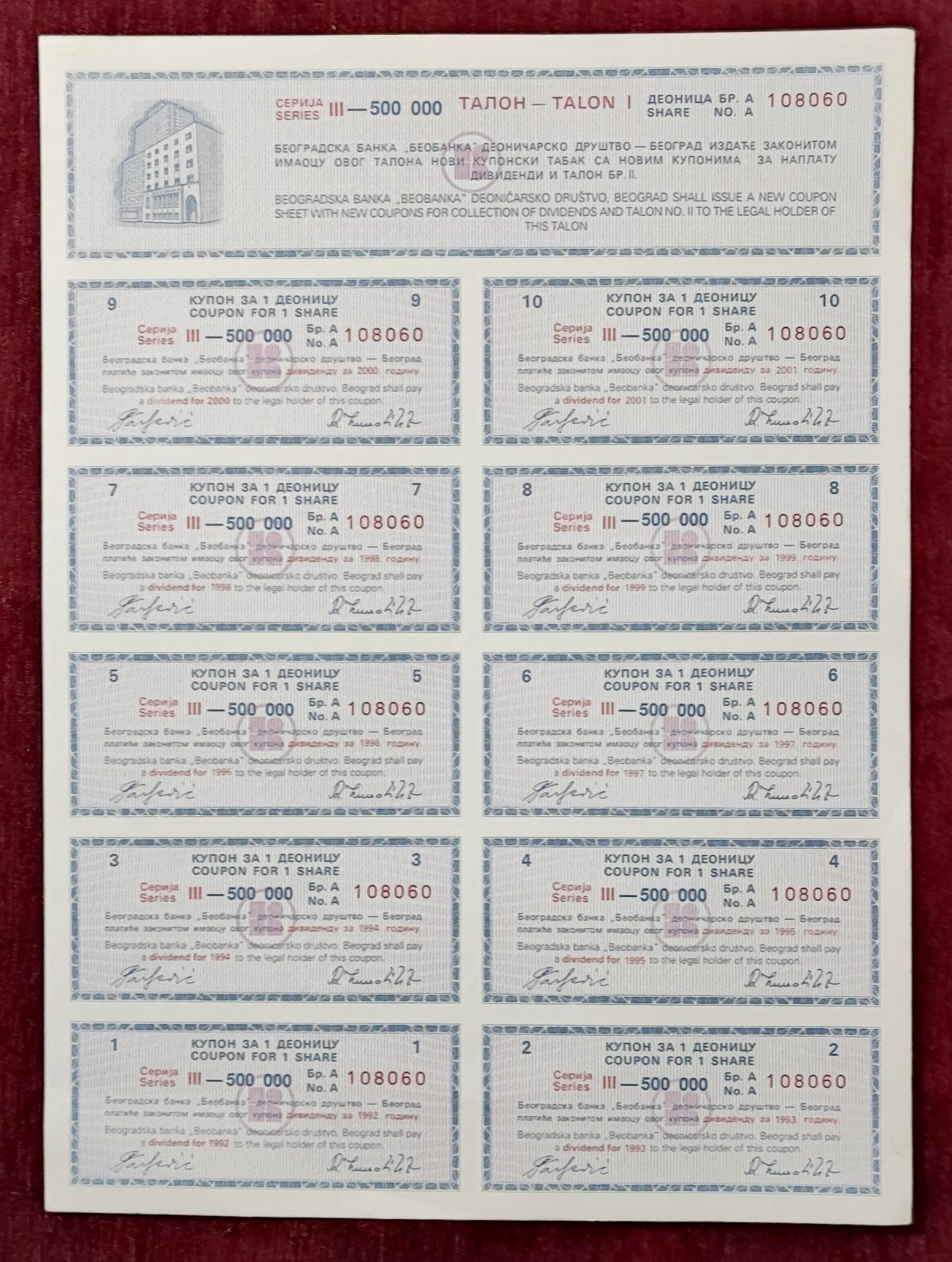 An original vintage paper bond issued by the Beobanka in 1992. Beobanka was shut down, with other domestic banks, after the civil war and the crash of the Yugoslavian economy during the 1990s. It was considered as one of the largest debtors in Serbia.