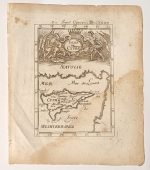 An engraved copperplate veduta of Cyprus from the German edition ”Beschreibung des ganzen Welt-kreisses” by Alain Manesson Mallet. The veduta features a war scene on the upper part of the map and in the middle of the scene the name ”Isles de Cypre” on a medallion. A figure number (Fig. CXXXII) is written after the German title, “Die Insel Cypern”, on the top right margin outside the borders of the veduta.