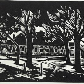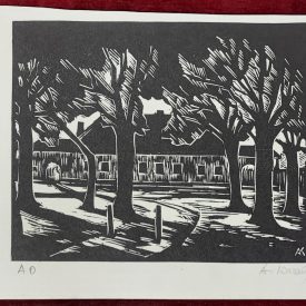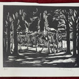 1970s Original signed woodcut Károly Andruskó Fence Trees House Landscape Dark