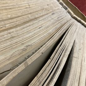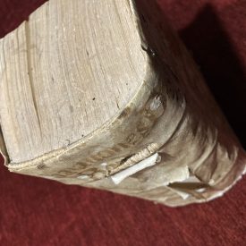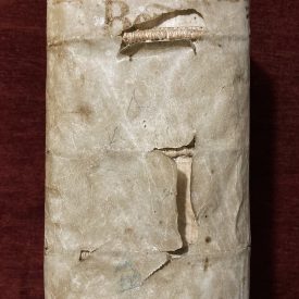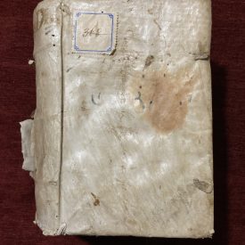 Binding: Vellum binding, library sticker on the front panel, and ink inscriptions on the front panel and spine cover. Minor imperfections along the edges of the panels, bottom spine extreme exposed, clamps missing, 2x holes on the spine cover (4x1cm, 2×5,5cm), spine exposed, hole on the back panel (1,2×1,5cm). Ink inscription on the flyleaf, numerous wormholes.