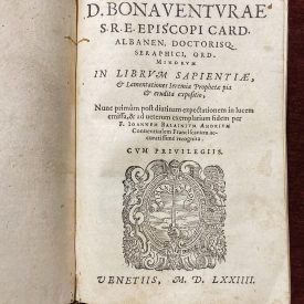 Three books by Saint Bonaventure bound together. The texts are co-authored by Ioanne Balaino and published in Venice, 1574. The commentaries encompass an enlightening exegesis of the gospel of Luke and the Lamentations of Jeremiah in the Book of Wisdom.