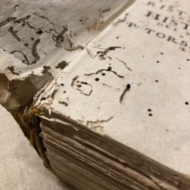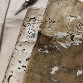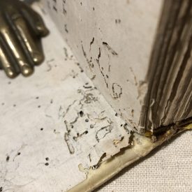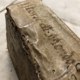 Binding: Original vellum binding. Damaged, detached spine cover, wormholes, signs of wear, stains, cocked spine.