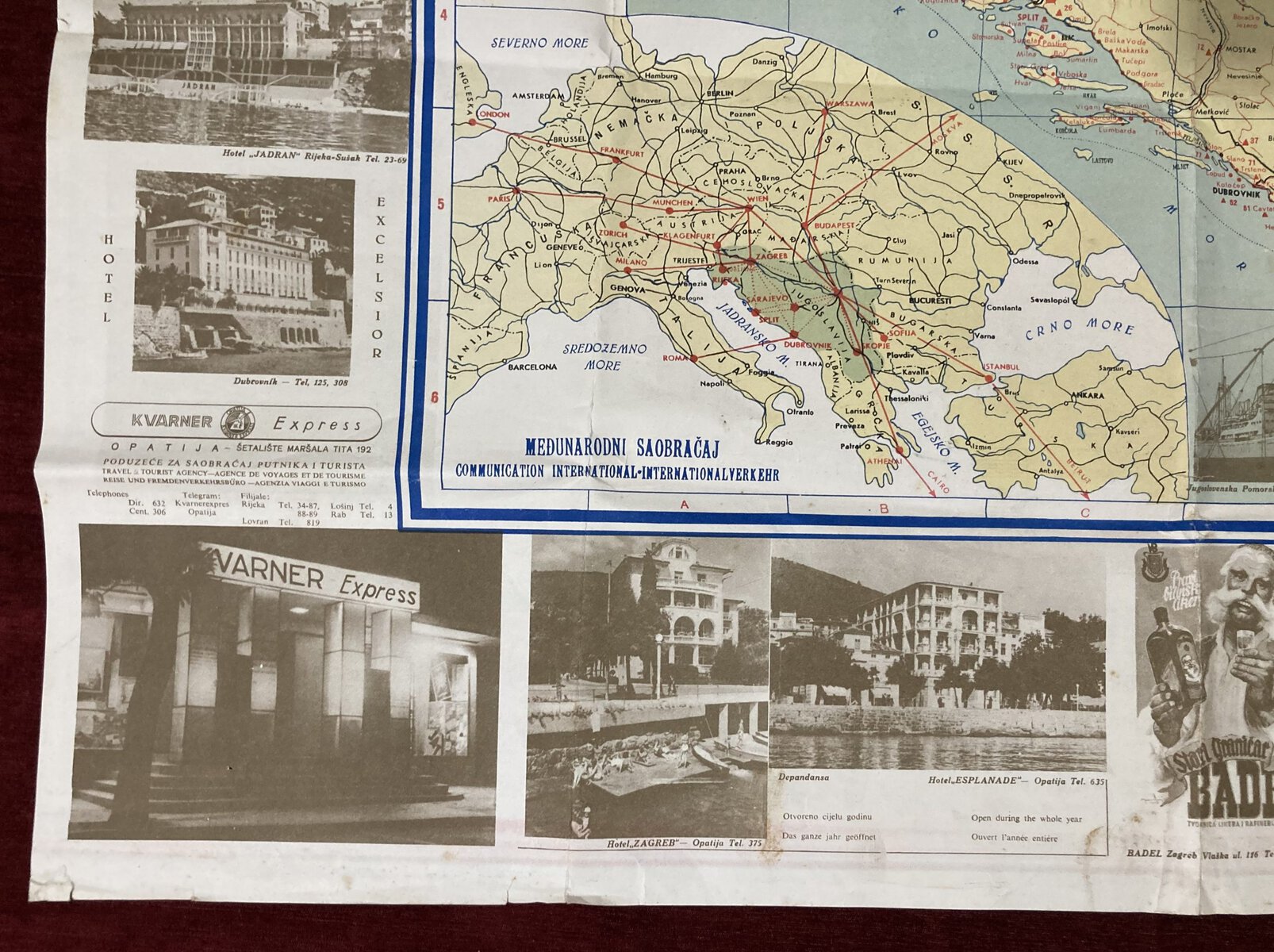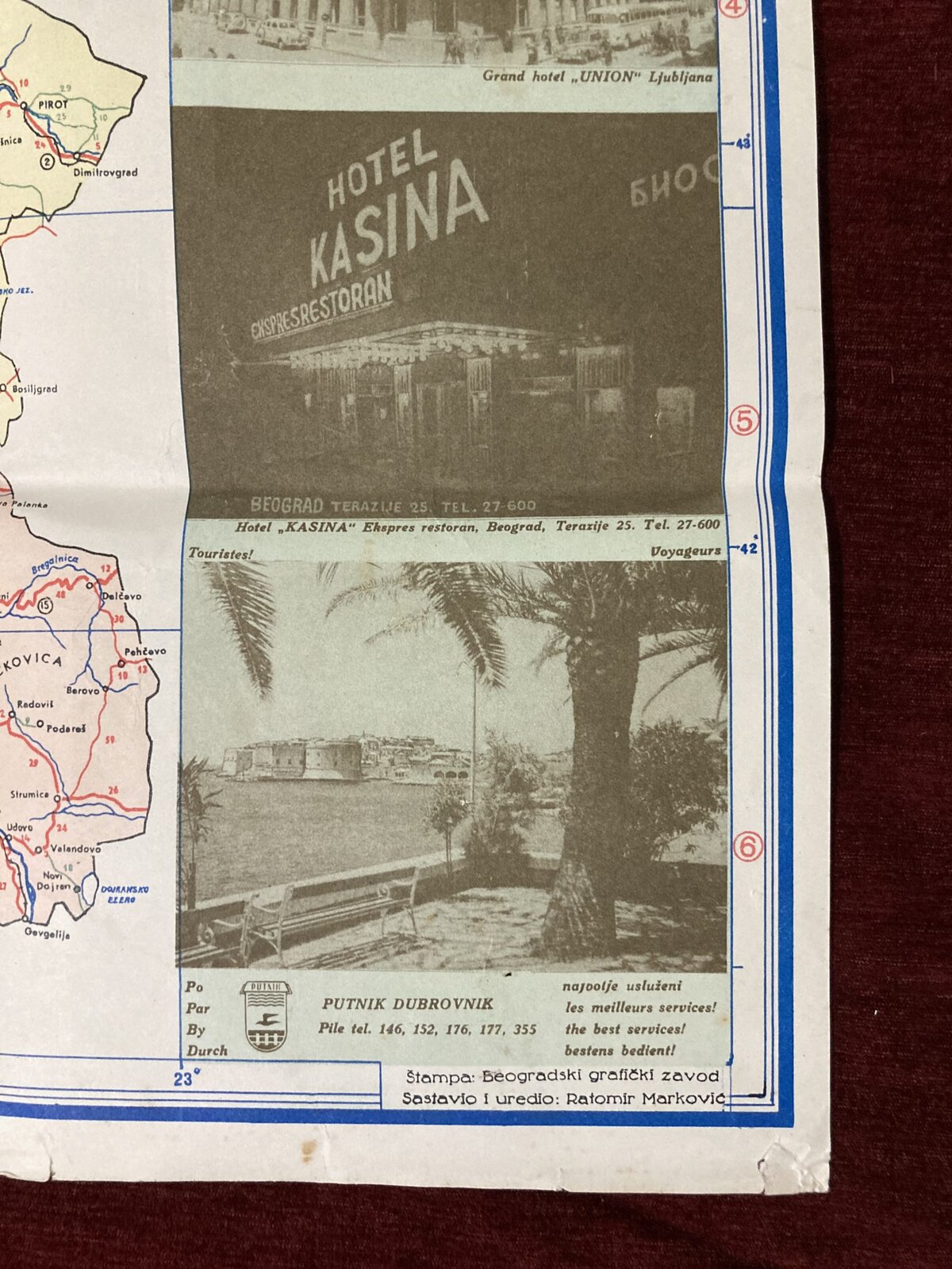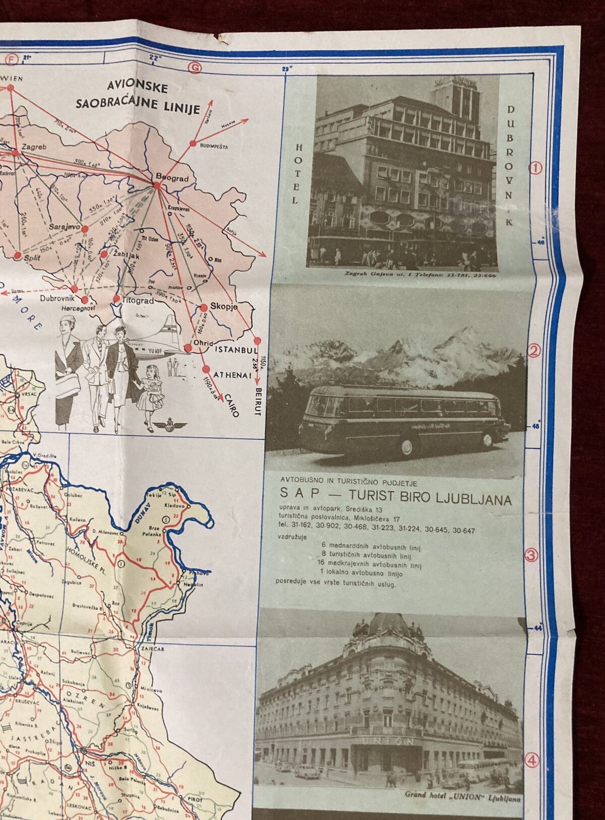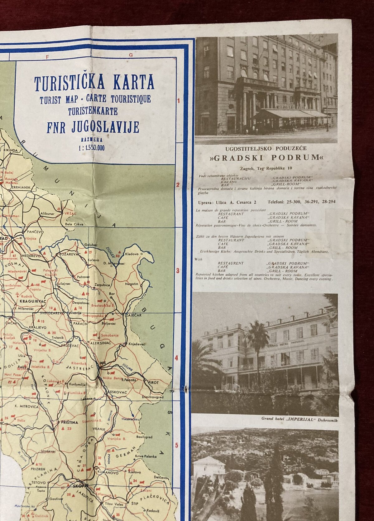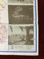 Vintage touristic map of FNR Yugoslavia showing all the important touristic sites, traffic routes and regions of once great country of Yugoslavia. Map also contains vintage advertising images. Folding map.
