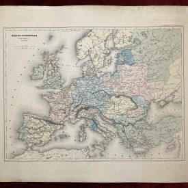 The antique map titled “Europe occidentale de 962 à 1492 de J. C.” by Auguste Henri Dufour, published by Europa in 1861 is a historical map that shows the political boundaries and major cities of Western Europe from the year 962 to 1492 AD.