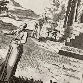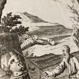 A highly detailed copperplate depicts a scene from Hebrew history, showing teraphim figurines, as they were understood and used by the ancient Hebrews.