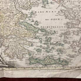Rare and highly detailed Homann’s old map of Danube, Greece, the Balkans, and adjacent parts of the Adriatic and Aegean Seas. Map contains a beautiful decorative cartouche and a large inset map of the Upper Danube region. Map is showing the straits from the Aegean into the Black Sea. From a very early edition of Homann’s Atlas Novus Terrarum.