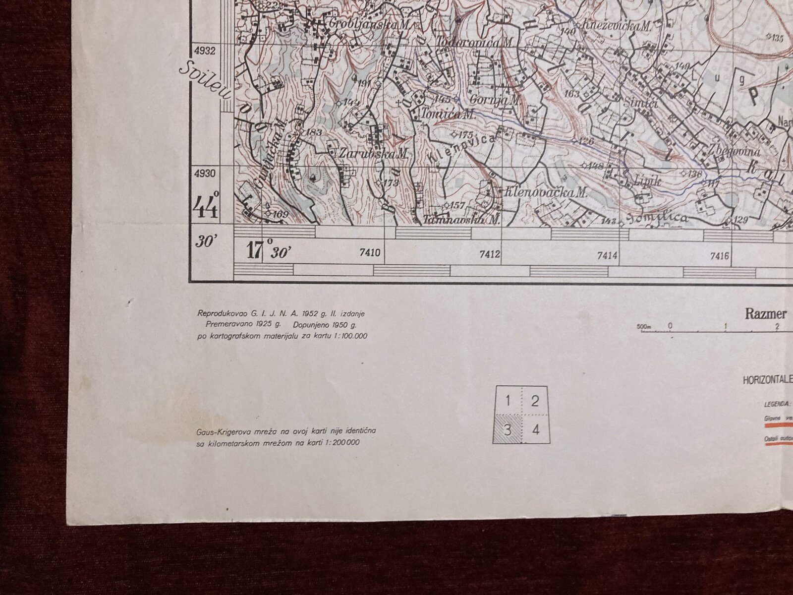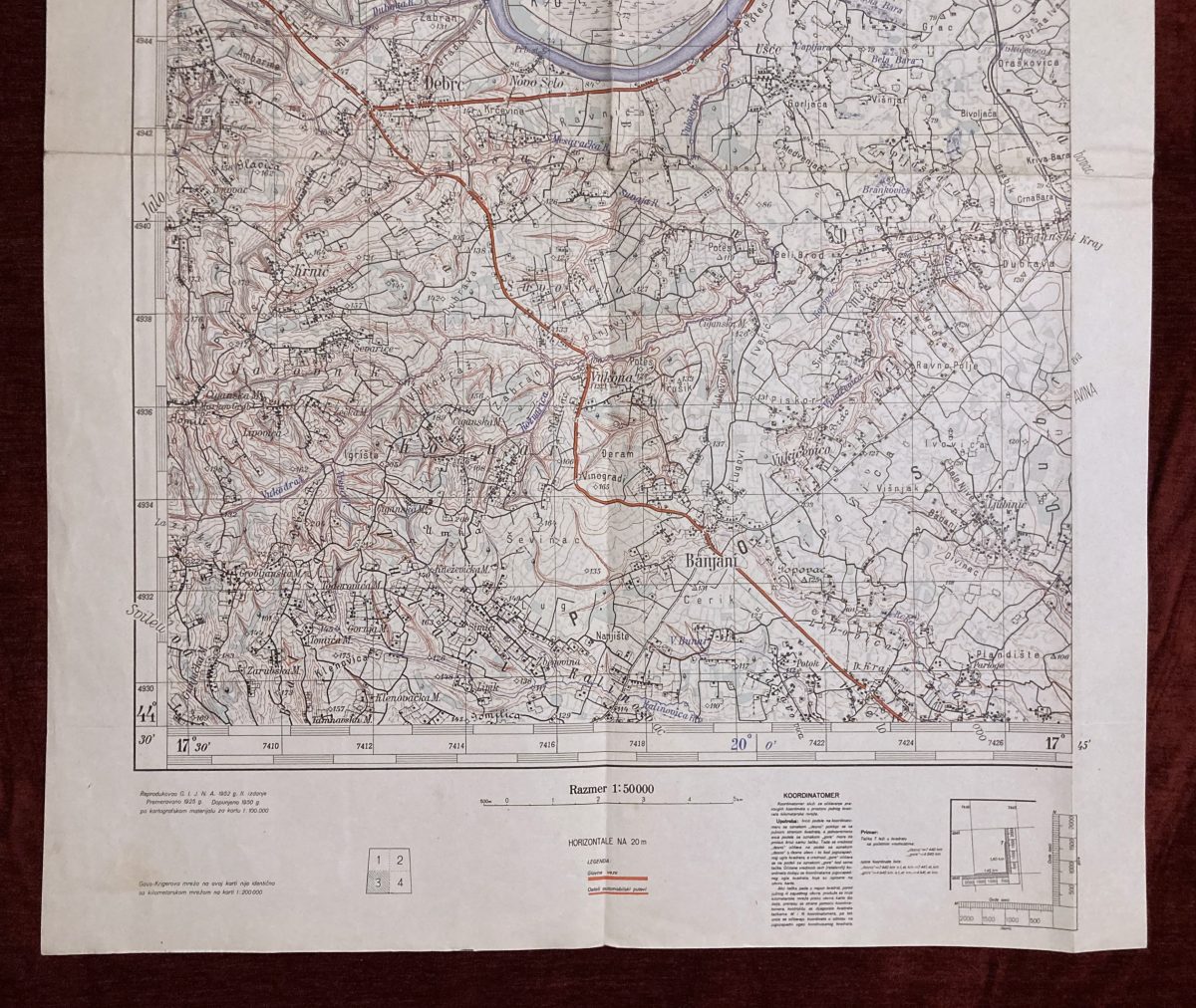 Dimensions: 68,5 x 48,5 cm. Scale: 1 : 50.000. Year: 1952. Printed by Војногеографски институт (Military Geographical Institute) in Belgrade, Serbia. Map of the Југословенске народне армије (Yugoslav People’s Army).
