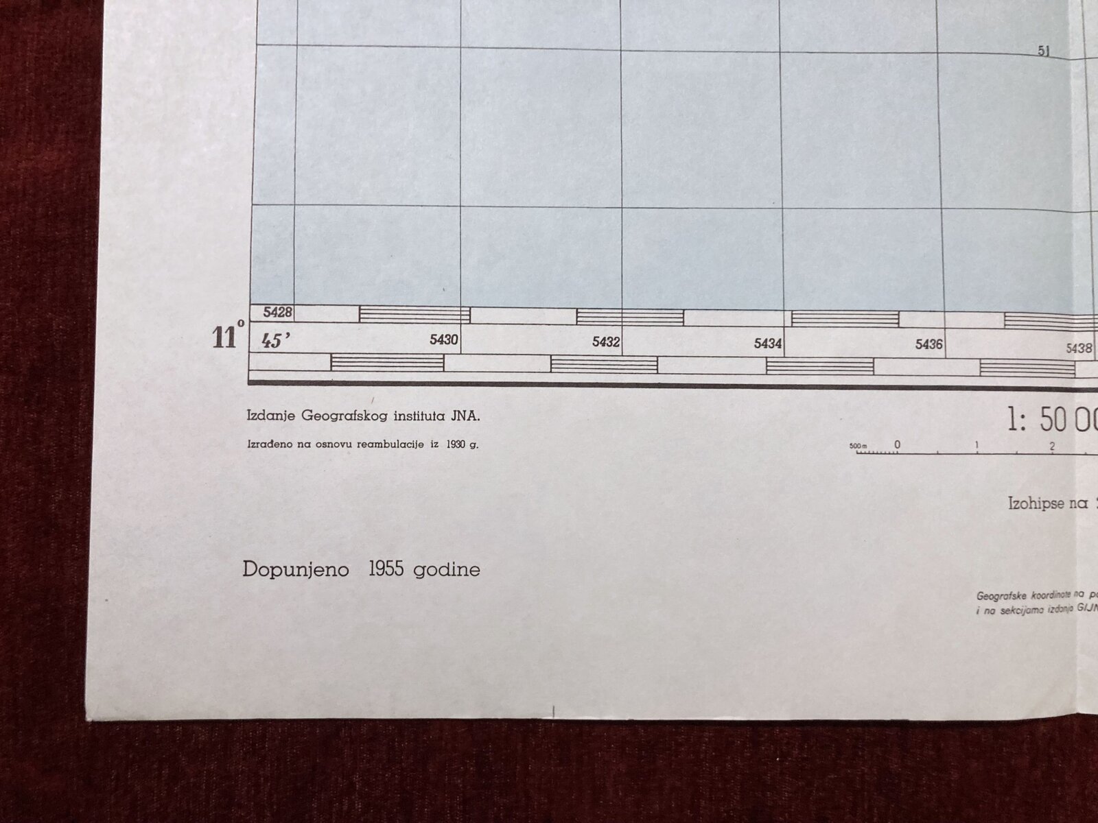 Dimensions: 68,5 x 48,5 cm. Scale: 1 : 50.000. Year: 1953. Printed by Војногеографски институт, Београд (Military Geographical Institute) in Belgrade, Serbia. Map of the Југословенске народне армије (Yugoslav People’s Army).