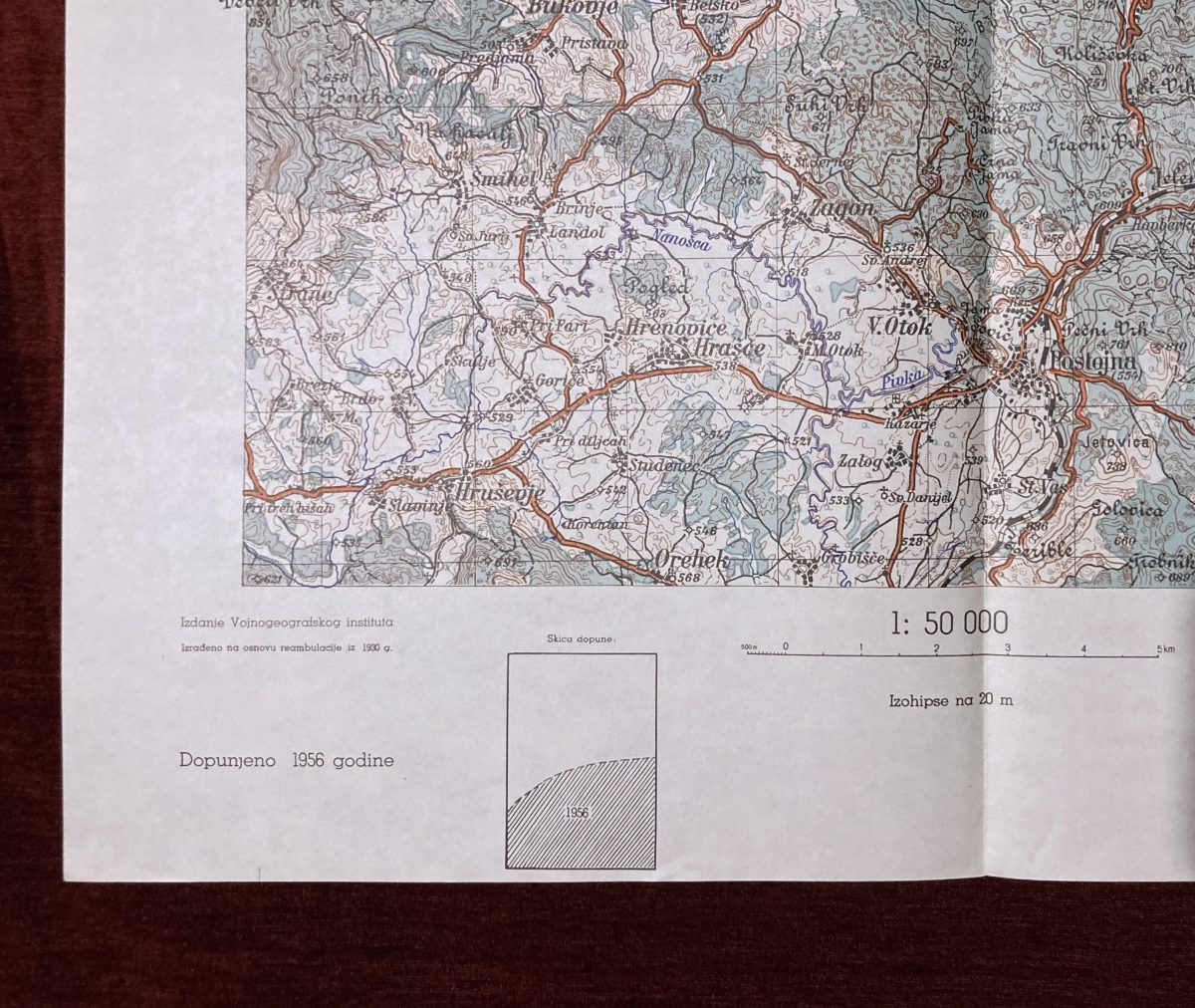 Dimensions: 68,5 x 48,5 cm. Scale: 1 : 50.000. Year: 1956. Printed by Војногеографски институт, Београд (Military Geographical Institute) in Belgrade, Serbia. Map of the Југословенске народне армије (Yugoslav People’s Army).