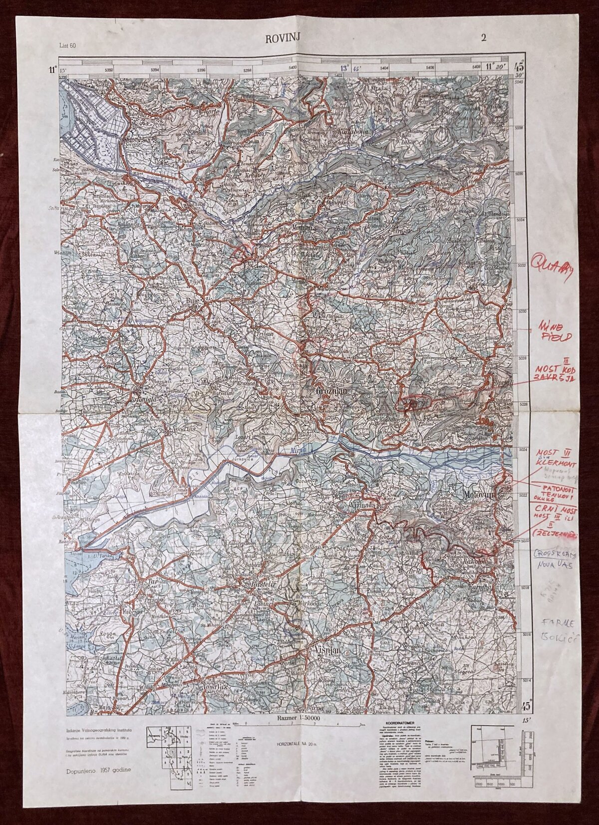 Dimensions: 68,5 x 48,5 cm. Scale: 1 : 50.000. Year: 1957. Printed by Војногеографски институт, Београд (Military Geographical Institute) in Belgrade, Serbia. Map of the Југословенска народна армија (Yugoslav People’s Army).