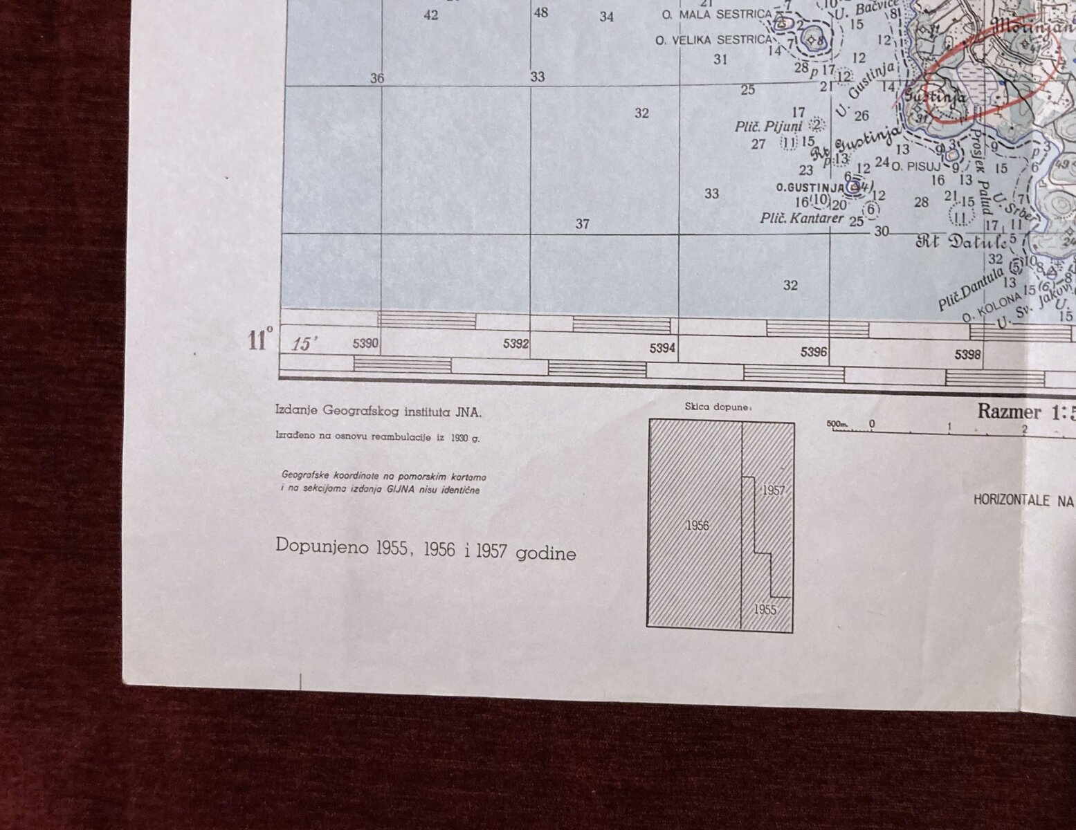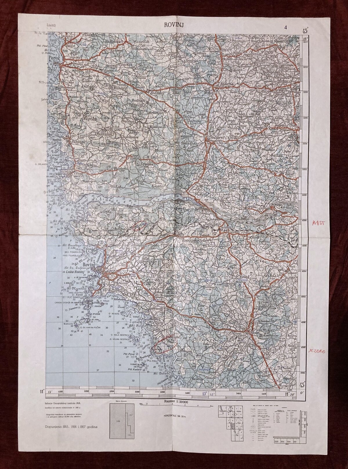 Dimensions: 68,5 x 48,5 cm. Scale: 1 : 50.000. Year: 1957. Printed by Војногеографски институт, Београд (Military Geographical Institute) in Belgrade, Serbia. Map of the Југословенске народне армије (Yugoslav People’s Army).