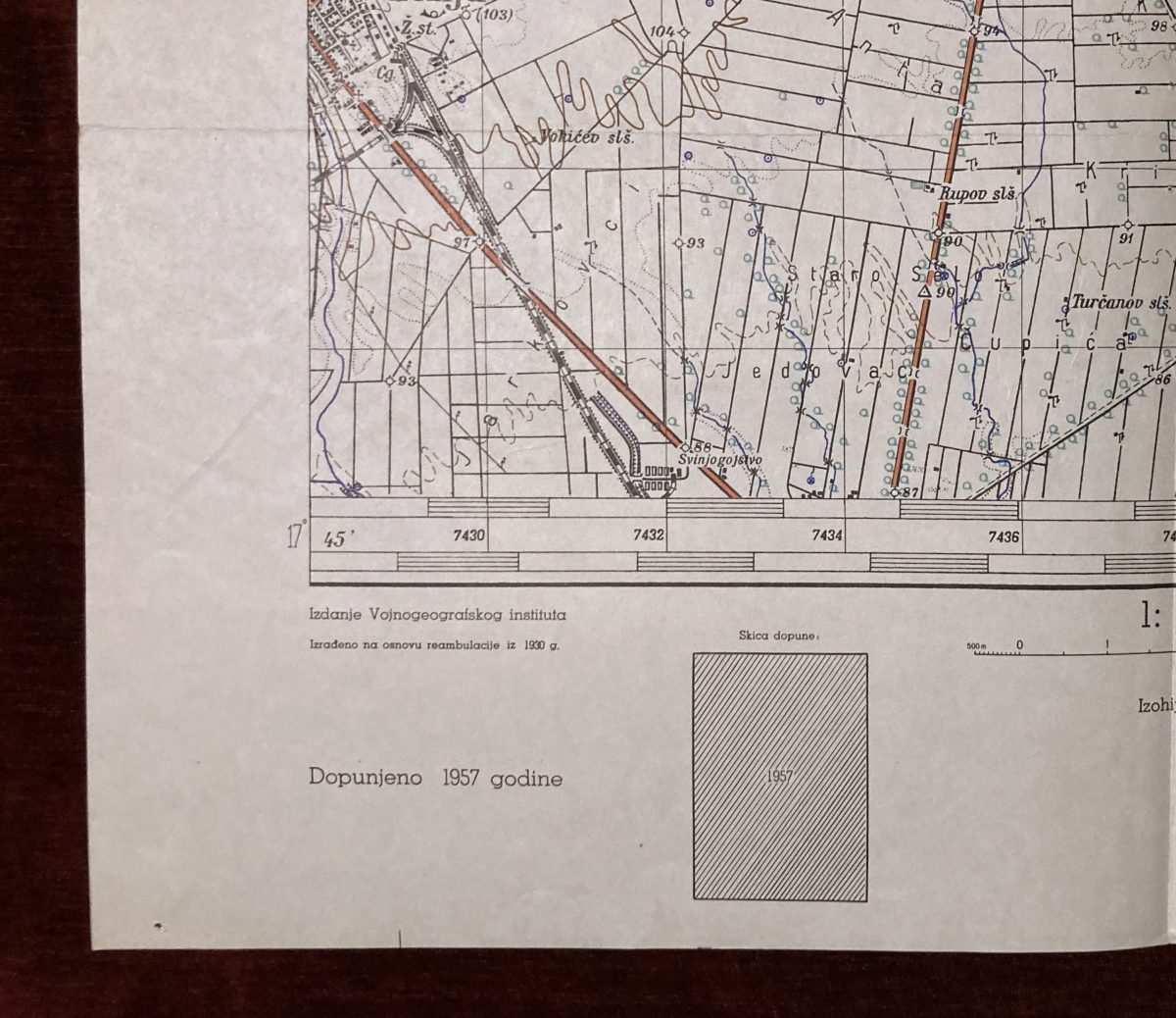 Dimensions: 65,5 x 48,5 cm. Scale: 1 : 50.000. Year: 1957. Printed by Војногеографски институт, Београд (Military Geographical Institute) in Belgrade, Serbia. Map of the Југословенске народне армије (Yugoslav People’s Army).