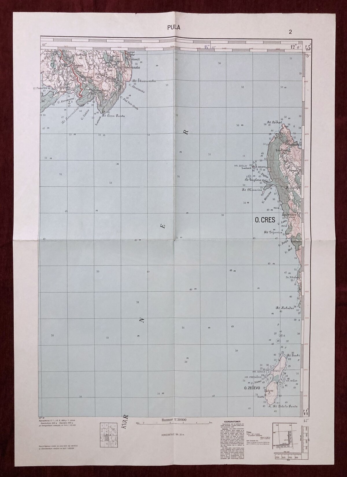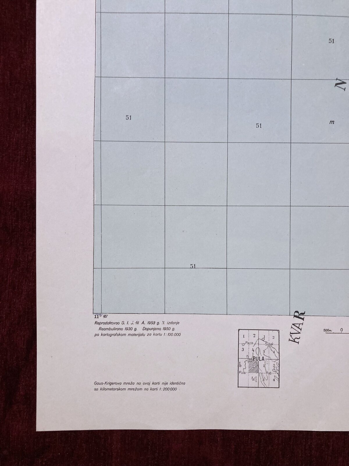 Dimensions: 68,5 x 48,5 cm. Scale: 1 : 50.000. Year: 1958. Printed by Војногеографски институт, Београд (Military Geographical Institute) in Belgrade, Serbia. Map of the Југословенске народне армије (Yugoslav People’s Army).