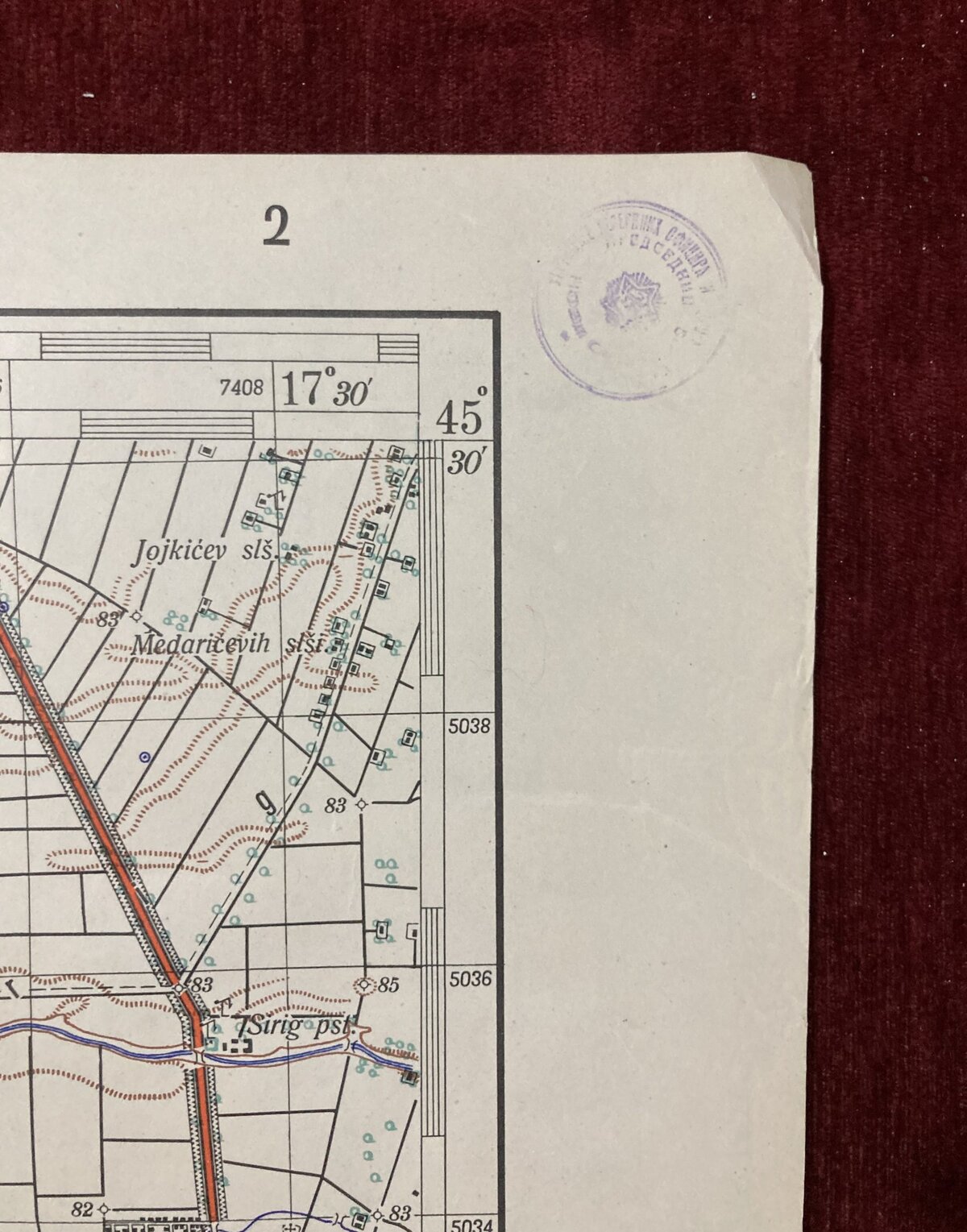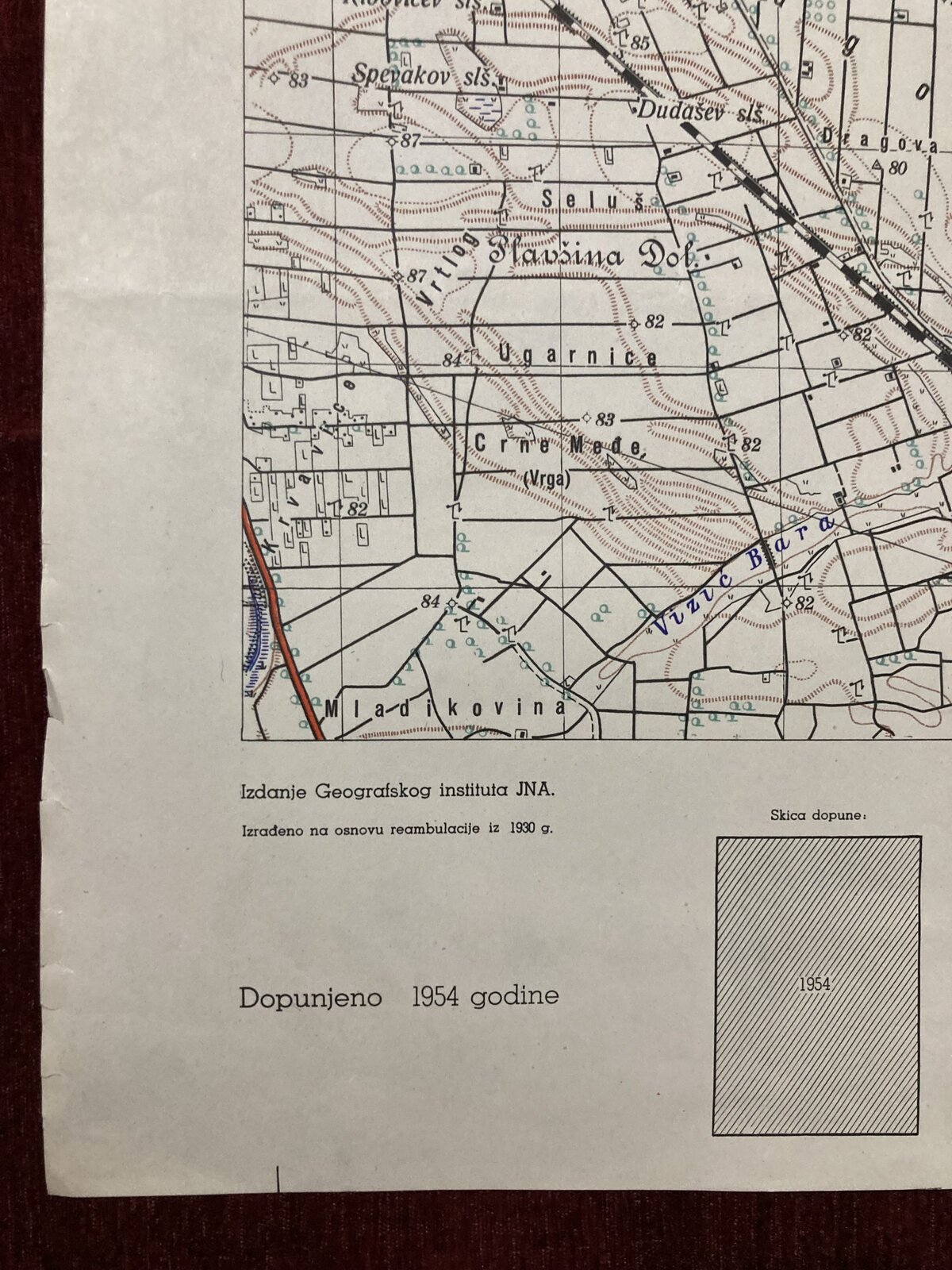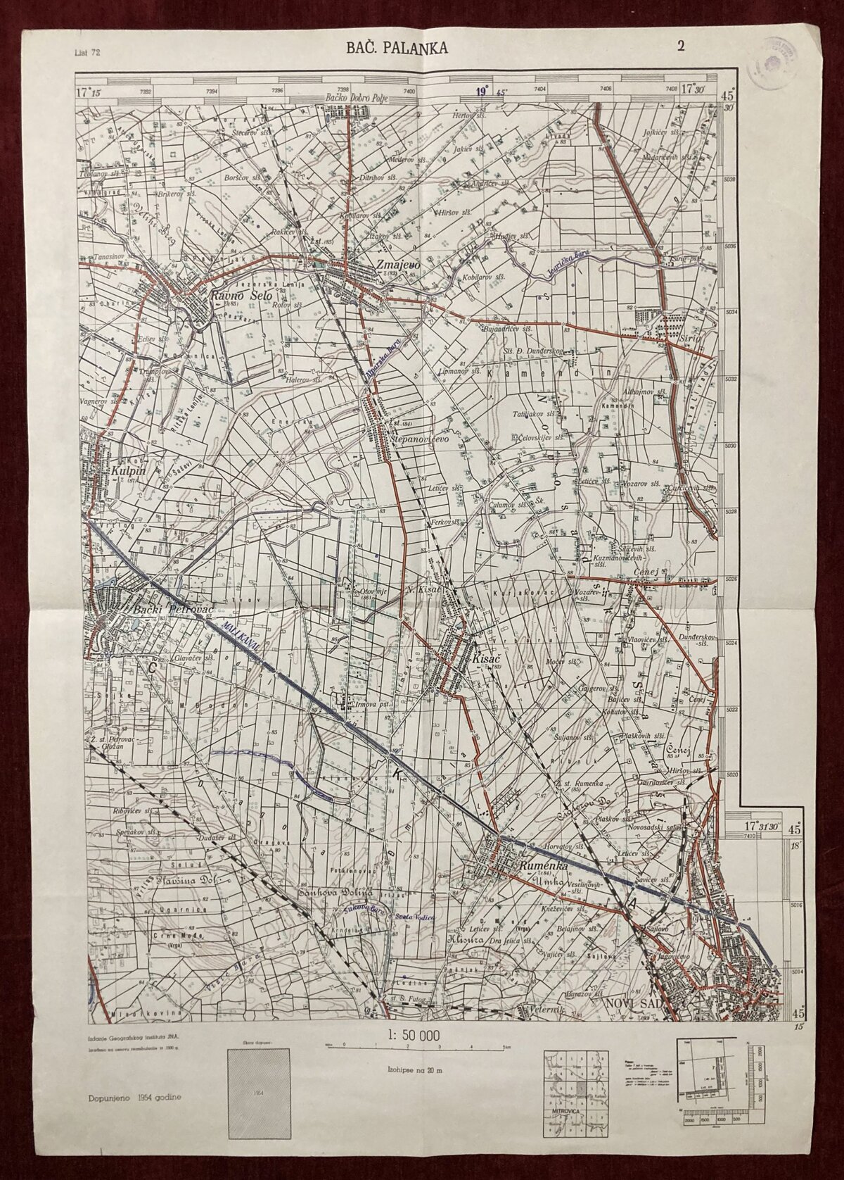 An original military map showing the territory of Bačka Palanka and its surroundings. The map shows Novi Sad and Rumenka to the south, Jegrička Zmajevo and Ravno Selo to the north, Kupin to the west, and Cenej to the East. It was printed by the JNA (Yugoslav People’s Army) in 1954.