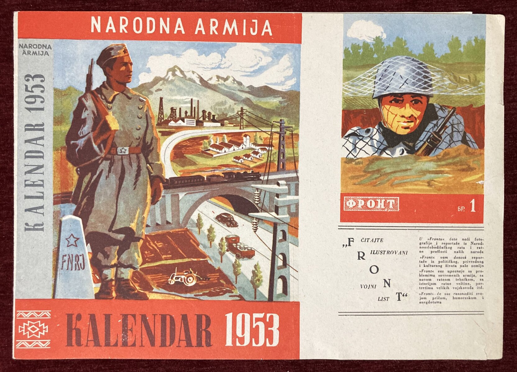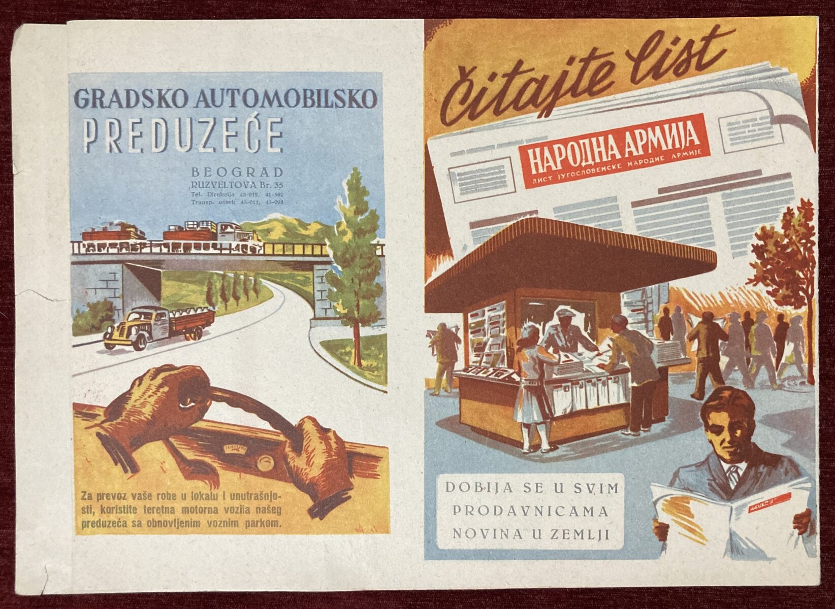 A 1953 vintage illustrated brochure from the Narodna Armija magazine from Yugoslavia. The brochure features vintage advertisements in the style of social realism.