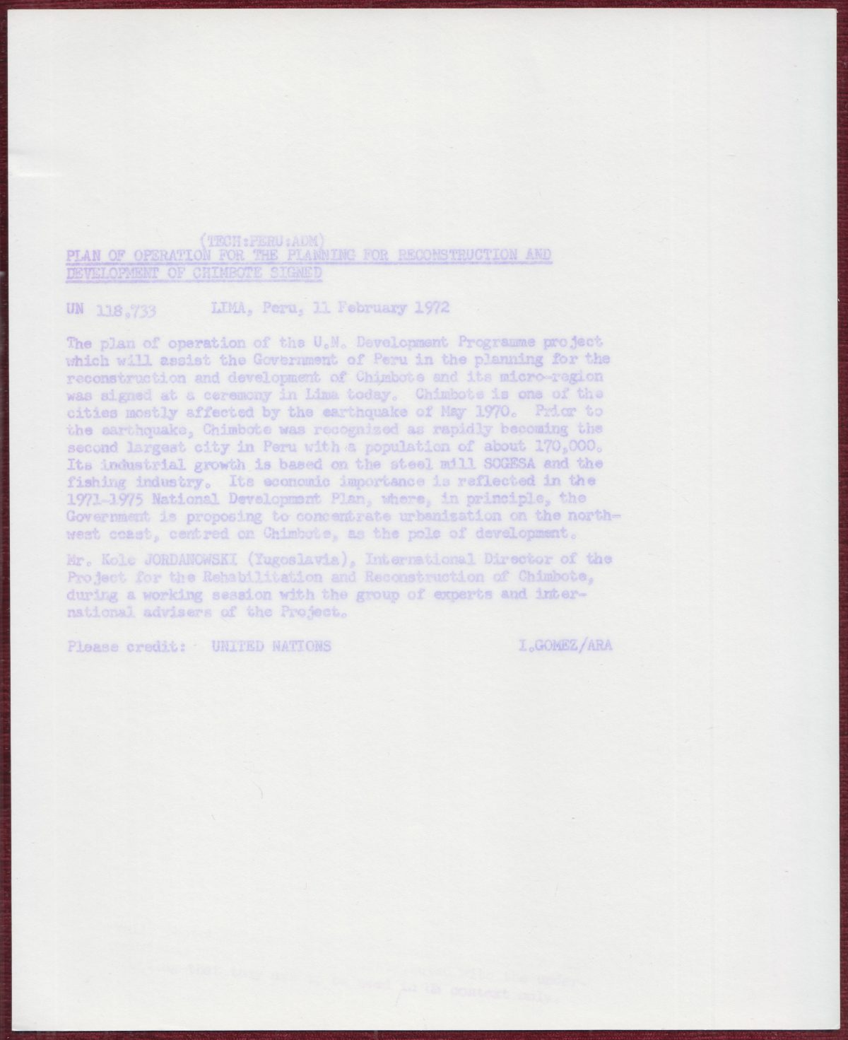 Plan of operation for the planning for reconstruction and development of Chimbote
