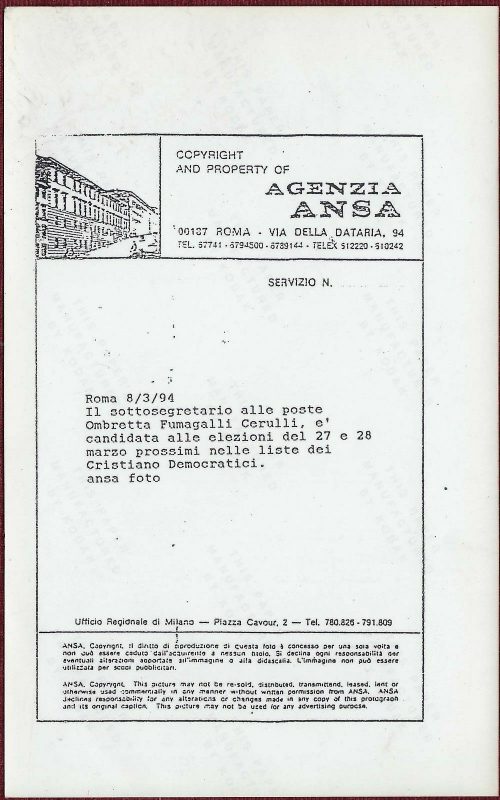 Original press photo    of   Ombretta Fumagalli Cerulli, Italian politician from Christian democratic political party (CCD) in Rome, Italy. Photograph:  ANSA Year made: Mar. 08 1994. Size: 203 x 126 mm. Condition: Very good. Please, see scans. Imperfections (if any) visible on the pictures.