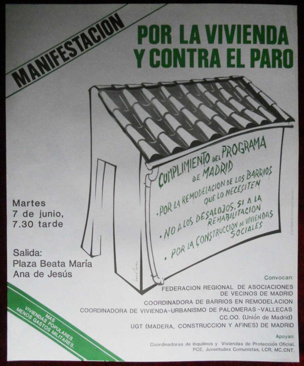 Original Vintage posterE S P A Ñ A  ( S P A I N ) MANIFESTACION (DEMONSTRATION)POR LA VIVIENDA Y CONTRA EL PARO(AGAINST THE HOME ENVIRONMENT AND UNEMPLOYMENT)7 June, 1983convocan: (convened:)FEDERACION REGIONAL DE ASOCIACIONES DE VECIONOS DE MADRID(REGIONAL FEDERATION OF ASSOCIATIONS OF NEIGHBOR TO MADRID)COORDINATORA DE BARRIOS EN REMODELACION(COORDINATOR OF DISTRICTS IN REMODELING)COORDINADORA DE VIVIENDA-URBANISMO DE PALOMERAS-VALLECAS(COORDINATOR OF URBAN HOUSING OF PALOMERO-VALLECAS)