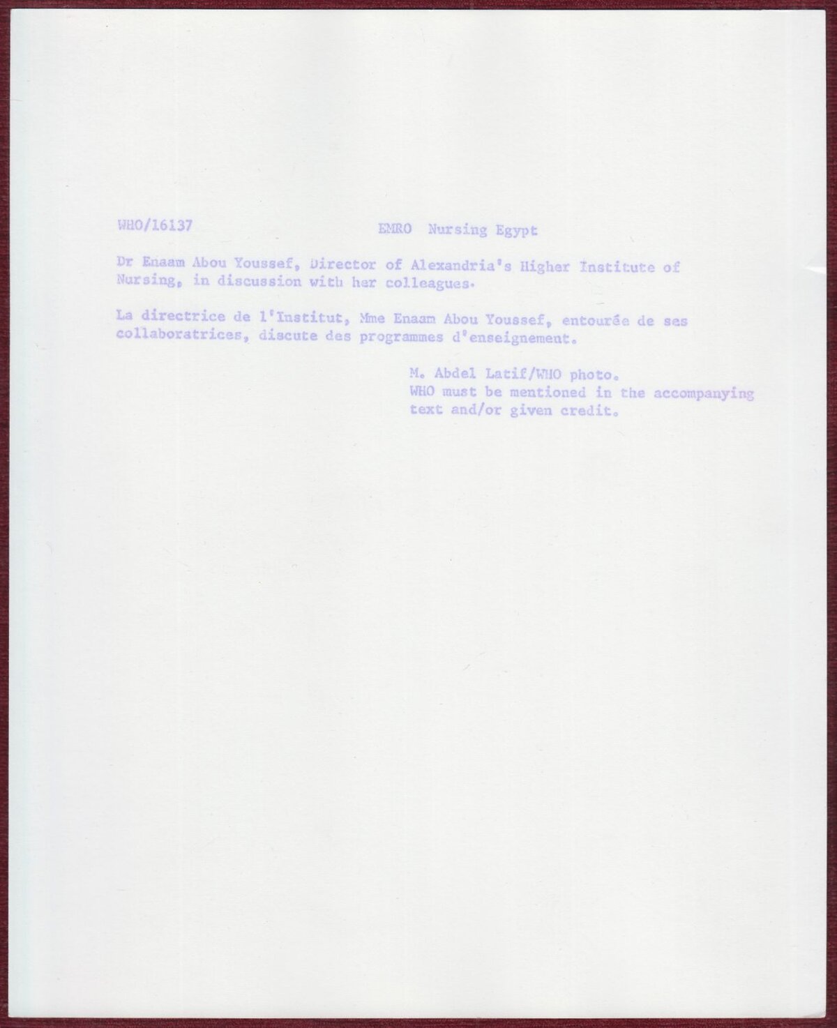 WHO press photo showing Dr. Enaam Abou Youssef, Director of Alexandria’s Higher Institute of Nursing, with her colleagues, highlighting nursing education and leadership in Egypt. Agency text on verso.