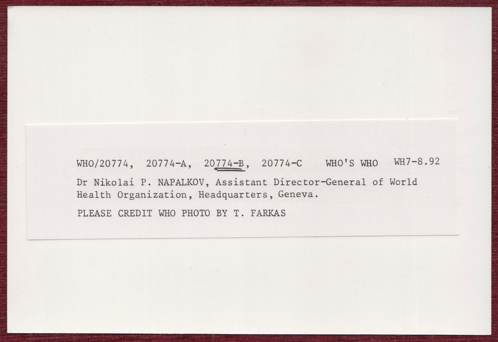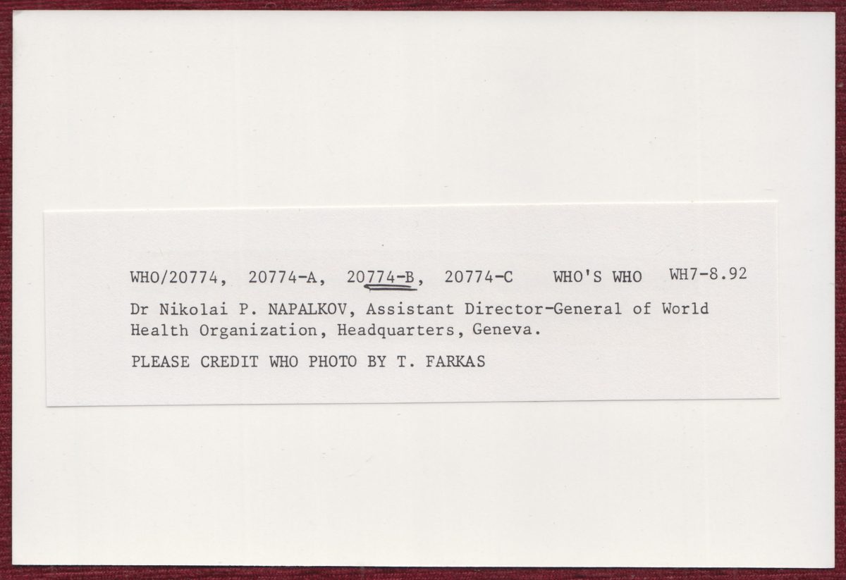 A WHO press photo by T. Farkas features Dr. Nikolai P. Napalkov, the Assistant Director-General of WHO, highlighting his leadership and contributions to global health.