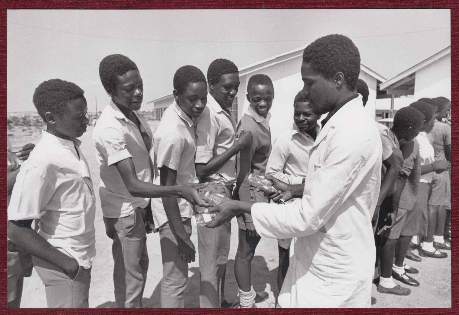 WHO Press Photo – People of Zimbabwean community giving their urine samples to a health worker